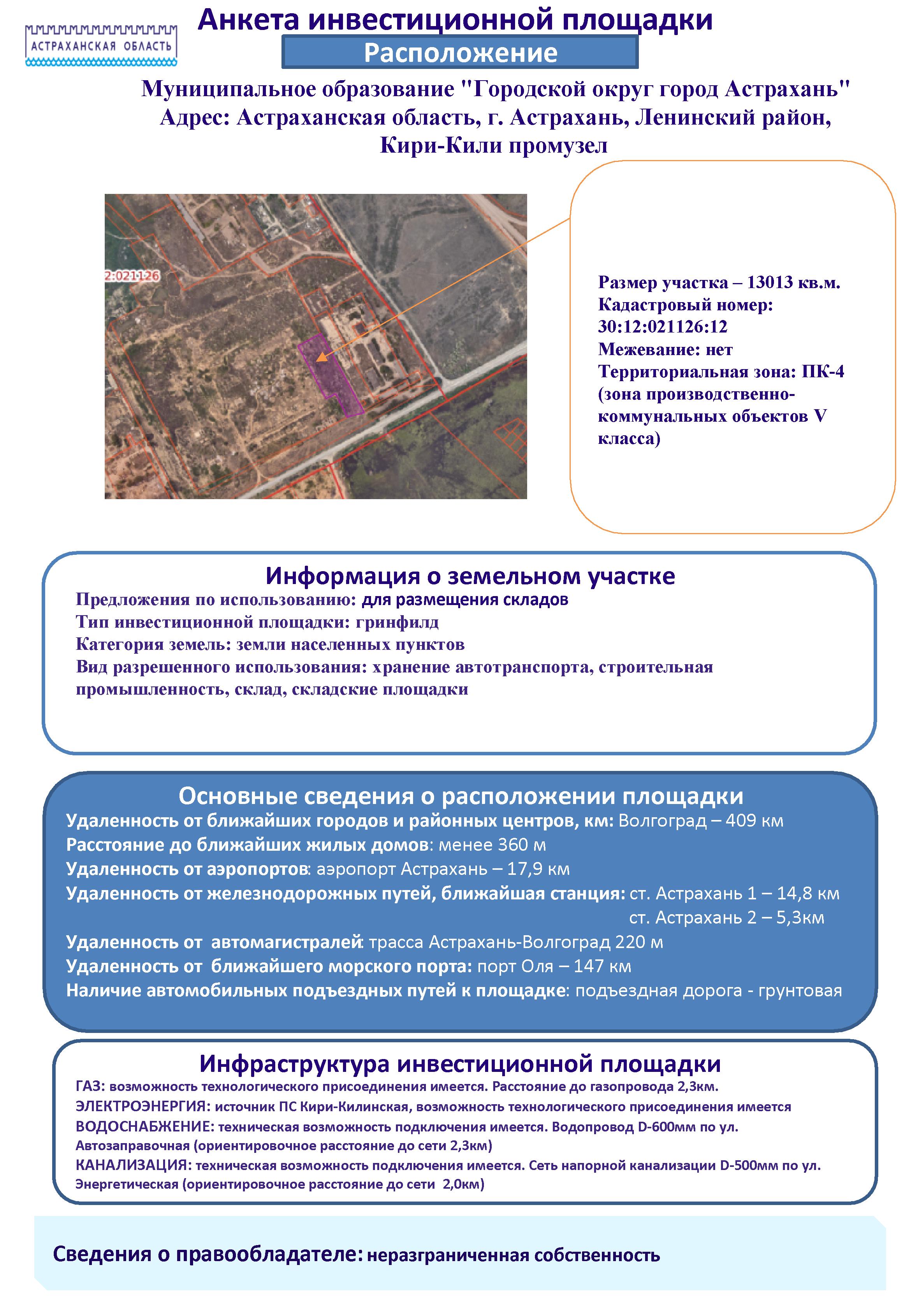 - Анкета инвестиционной площадки Астраханская область, г. Астрахань, Ленинский район, Кири-Кили проезд № 14