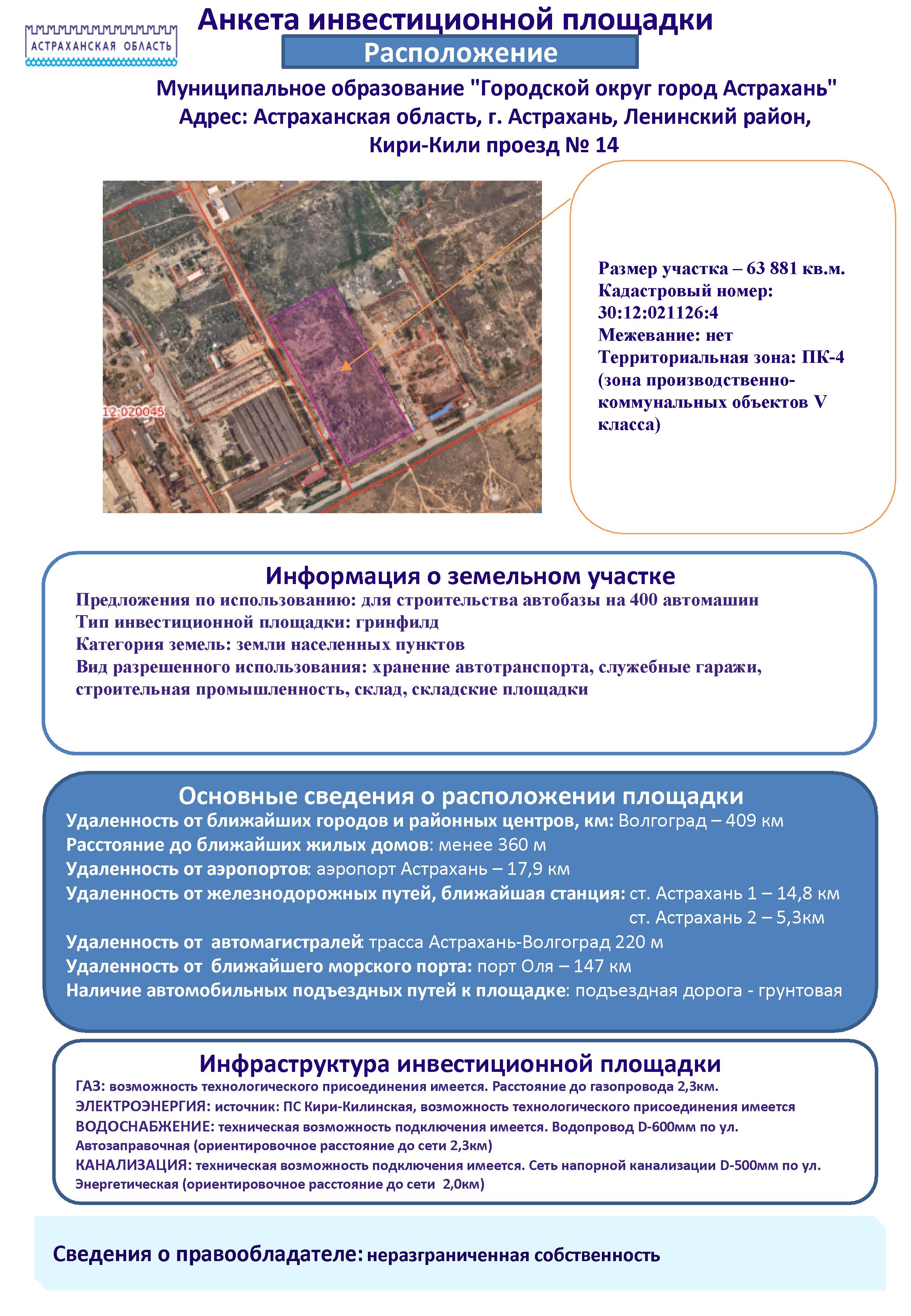 - Анкета инвестиционной площадки Астраханская область, г. Астрахань, Ленинский район, Кири-Кили проезд № 14