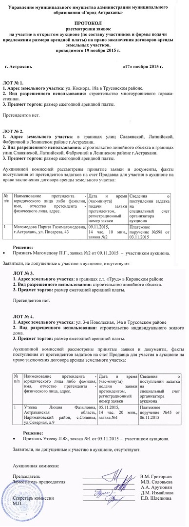 - Протоколы о результатах аукционов