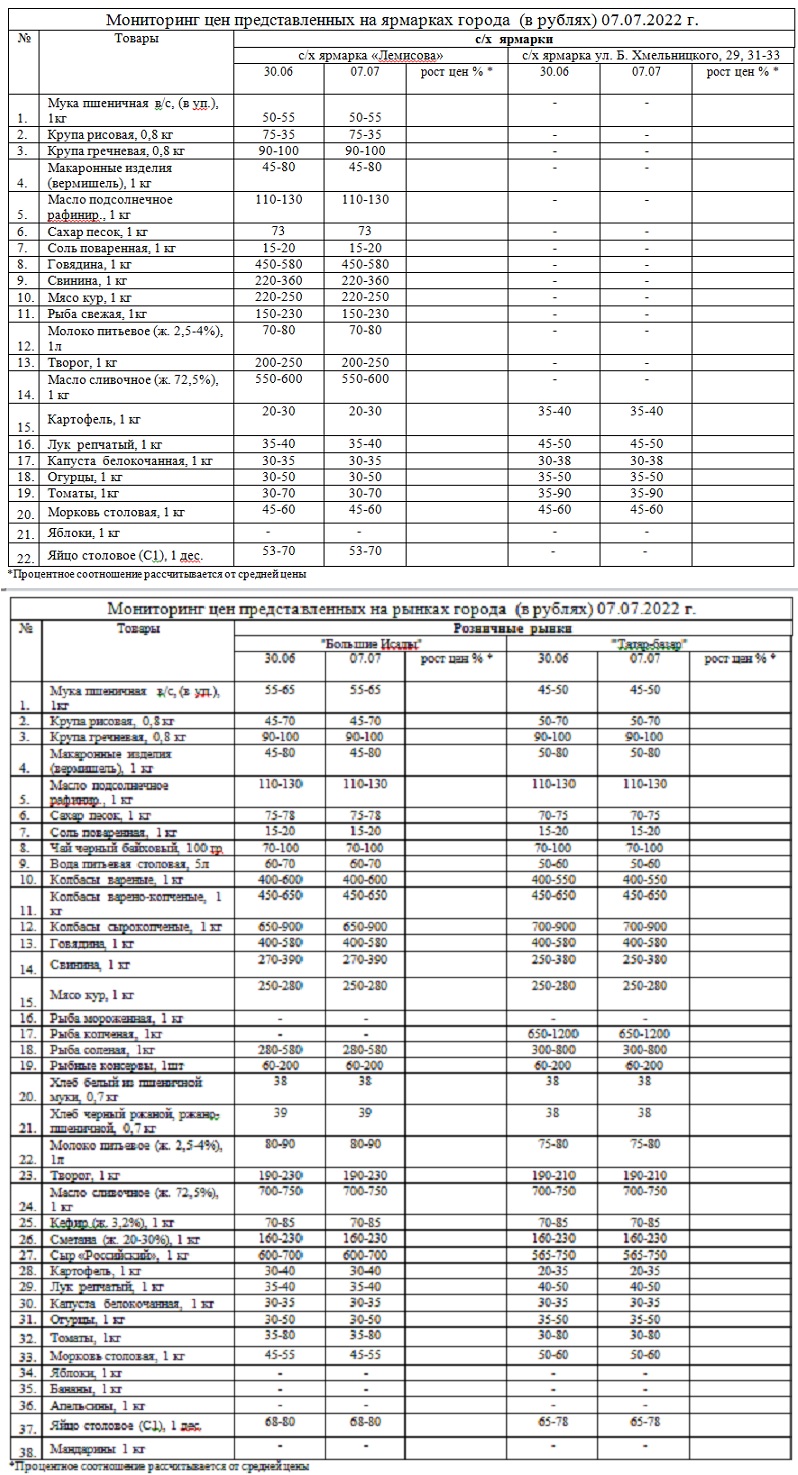 По результатам проведённого мониторинга, за период с 30.06.2022 по 07.07.2022, установлено, что цены стабилизировались на социально значимые группы товаров, а так же на сезонные овощи.