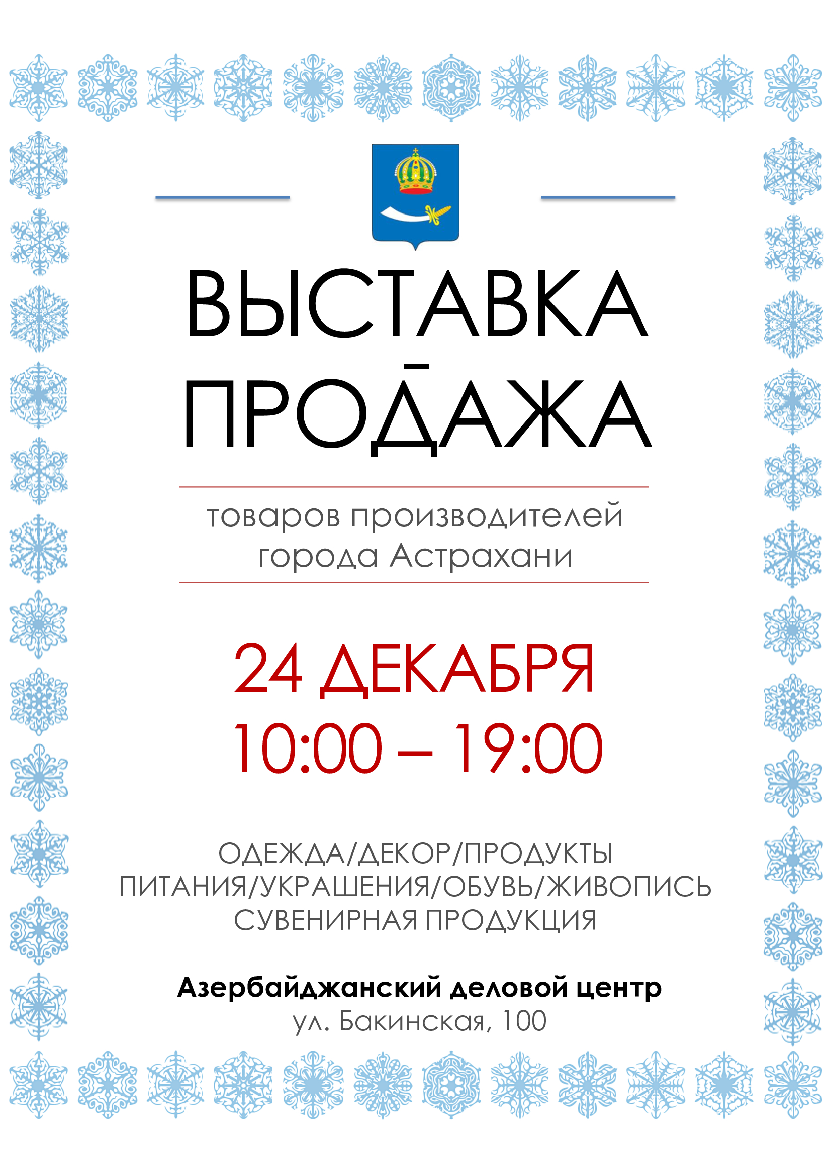 В связи с проведением Новогодних мероприятий: гуляний, ярмарок, конкурсов, елочных базаров и т. д. в Астрахани 24 декабря 2022 г. в Азербайджанском деловом центре (ул. Бакинская, 100) с 10.00 до 19.00 пройдет выставка-продажа товаров астраханских производителей. Выставка-продажа направлена на объединение творческих людей города, поддержку и развитие локальных производителей, а также популяризацию предпринимательской инициативы, как одной из сфер занятости горожан. Гости выставки-продажи смогут ознакомиться и приобрести изделия талантливых мастеров и производителей: предметы декора, аксессуары и бижутерию, одежду и обувь, сувенирную продукцию, выпечку, продукты и многое другое.