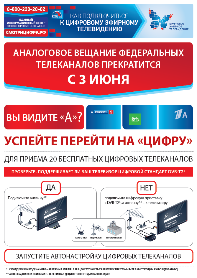 Антенну, приставку и соединительный антенный кабель можно приобрести в специализированных магазинах. Предварительно рекомендуем проконсультироваться о подключении цифрового эфирного телевидения по бесплатному номеру федеральной «горячей» линии: 8-800-220-20-02. Телефон работает в круглосуточном режиме.