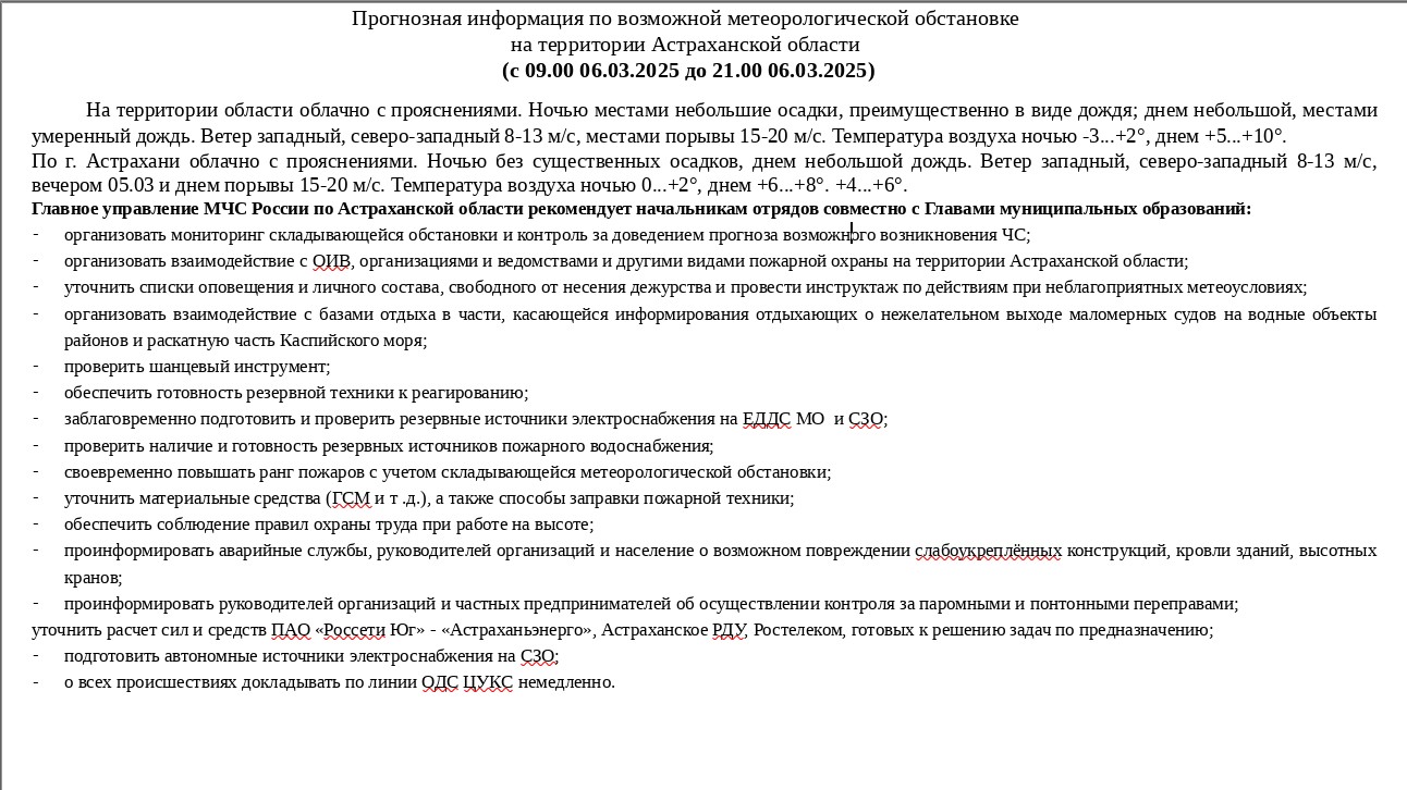 Оперативный ежедневный прогноз возникновения и развития параметров чрезвычайных ситуаций на территории Астраханской области на 06.03.2025 г.