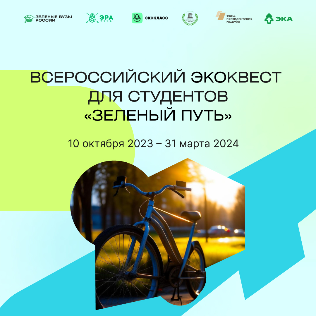 В заданиях всероссийского студенческого квеста «Зеленый Путь» – знания о влиянии транспорта на природу и практические рекомендации, которые помогут с комфортом пользоваться велосипедами, самокатами и другим экологичным транспортом. Участники квеста научатся строить веломаршруты, организуют экопикник, узнают о способах передвигаться по городу без личного автомобиля. Они также смогут сами дать старт «зеленым» изменениям – разработать и представить администрации план установки велопарковки на территории своего вуза. Победители получат памятные дипломы и призы.