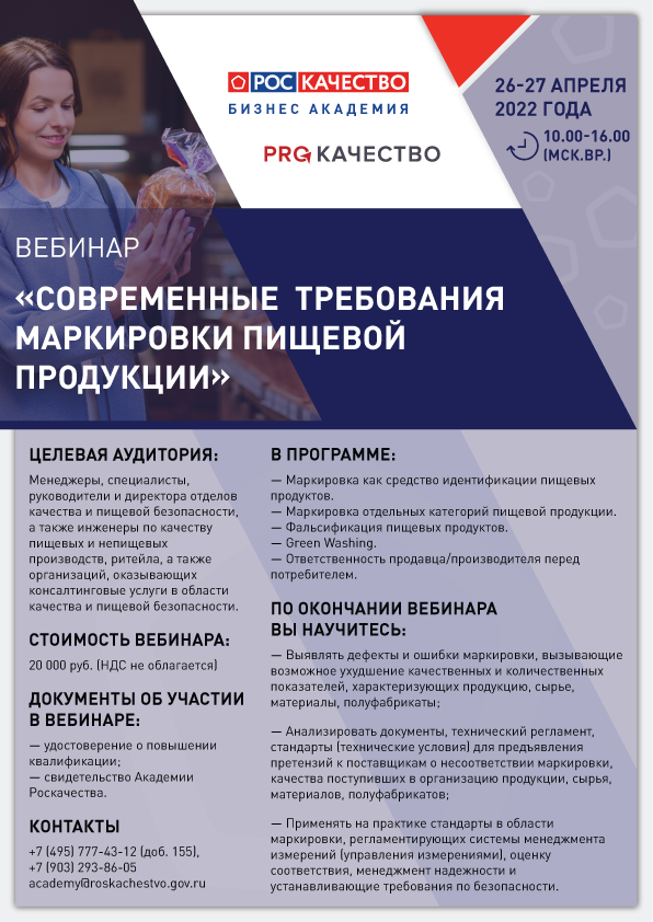 Автономная некоммерческая организация «Российская система качества» в целях предупреждения возникающих нарушений и оказания содействия добросовестным предпринимателям проводит вебинар «Современные требования маркировки пищевой продукции».
