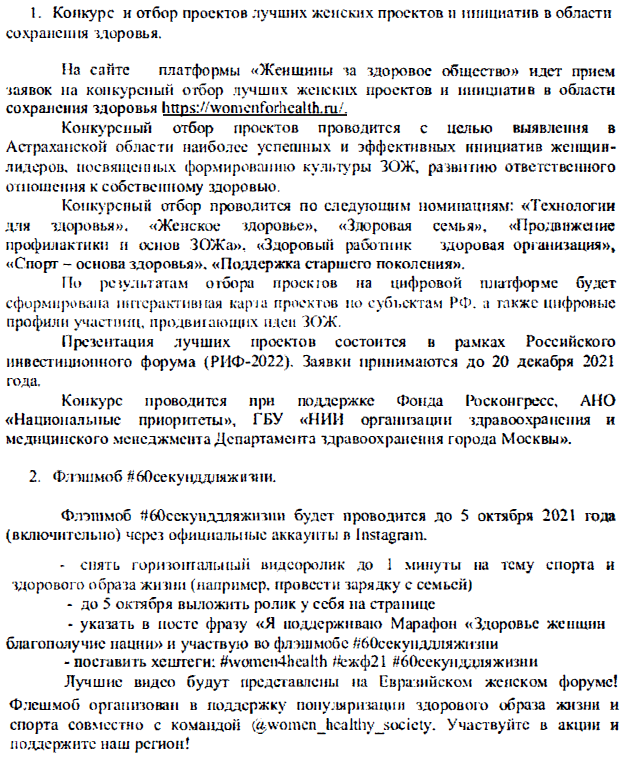 1. Конкурс по отбору лучших женских проектов и инициатив в области сохранения здоровья.