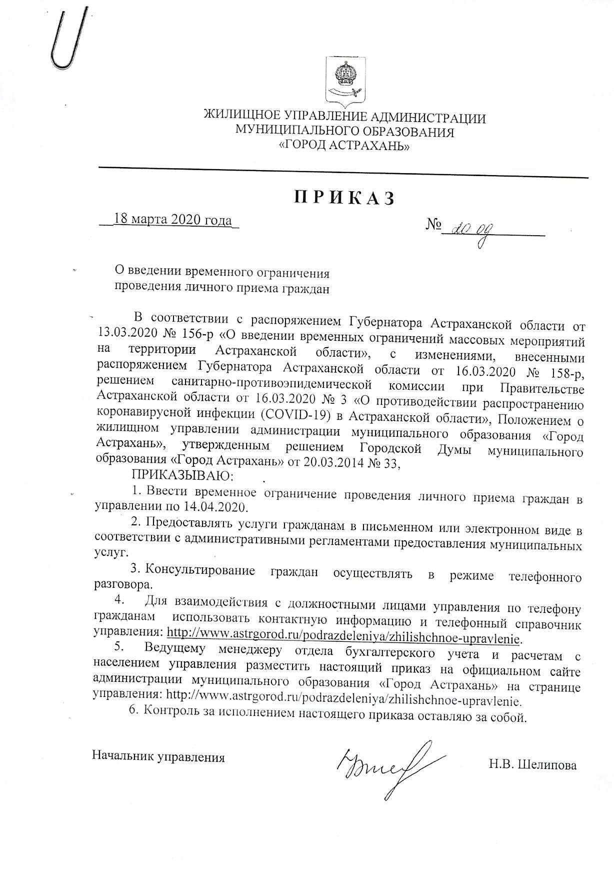 Во исполнение распоряжения Губернатора Астраханской области от 13.03.2020 № 156-р «О введении временных ограничений массовых мероприятий на территории Астраханской области», от 17.03.2020 № 159-р «О введении режима повышенной готовности на территории Астраханской области» в связи с распространением короновирусной инфекцией, а так же с учетом методических рекомендаций по режиму труда органов местного самоуправления, личный прием и личная подача письменных обращений граждан в жилищном управлении временно ограничены с целью профилактики.