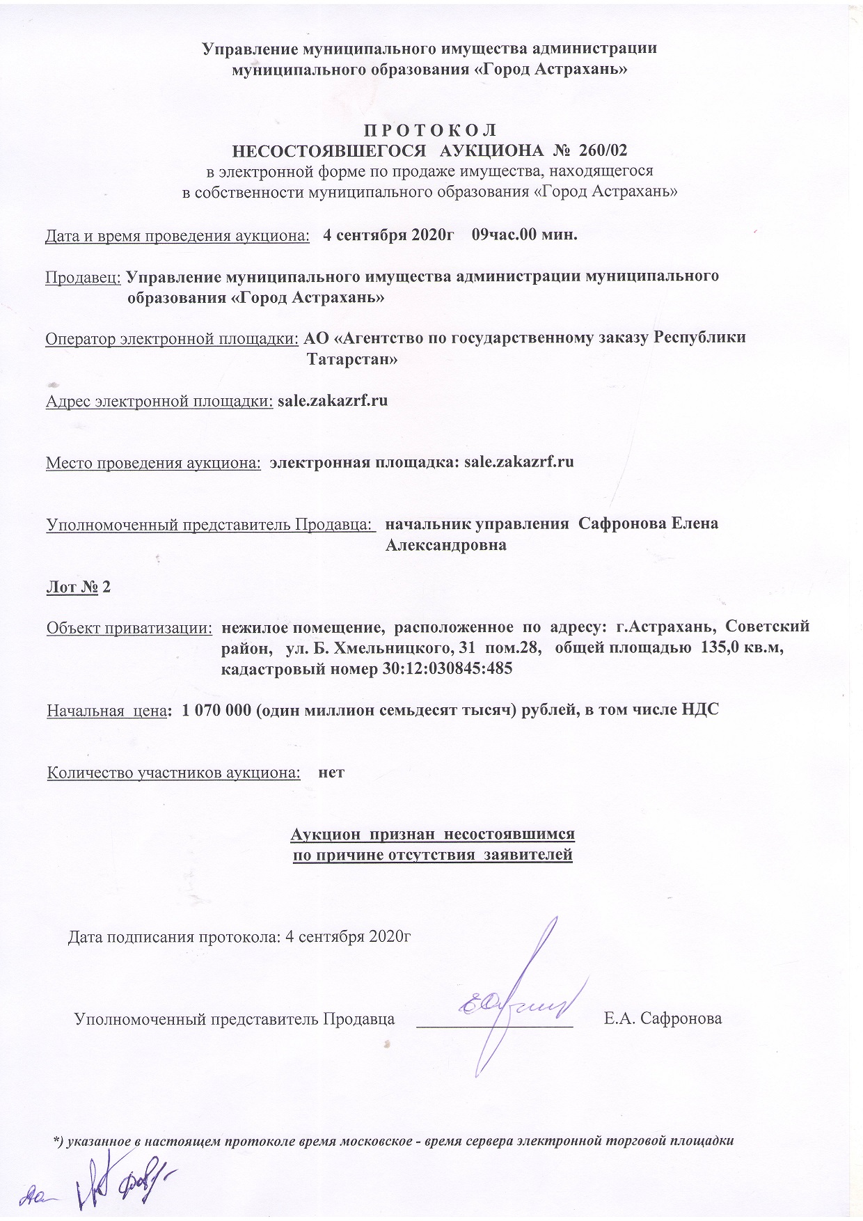 отчет об аукционе по продаже имущества, находящегося в собственности муниципального образования "Город Астрахань", проведенном управлением муниципального имущества администрации г.Астрахани 14.09.2020