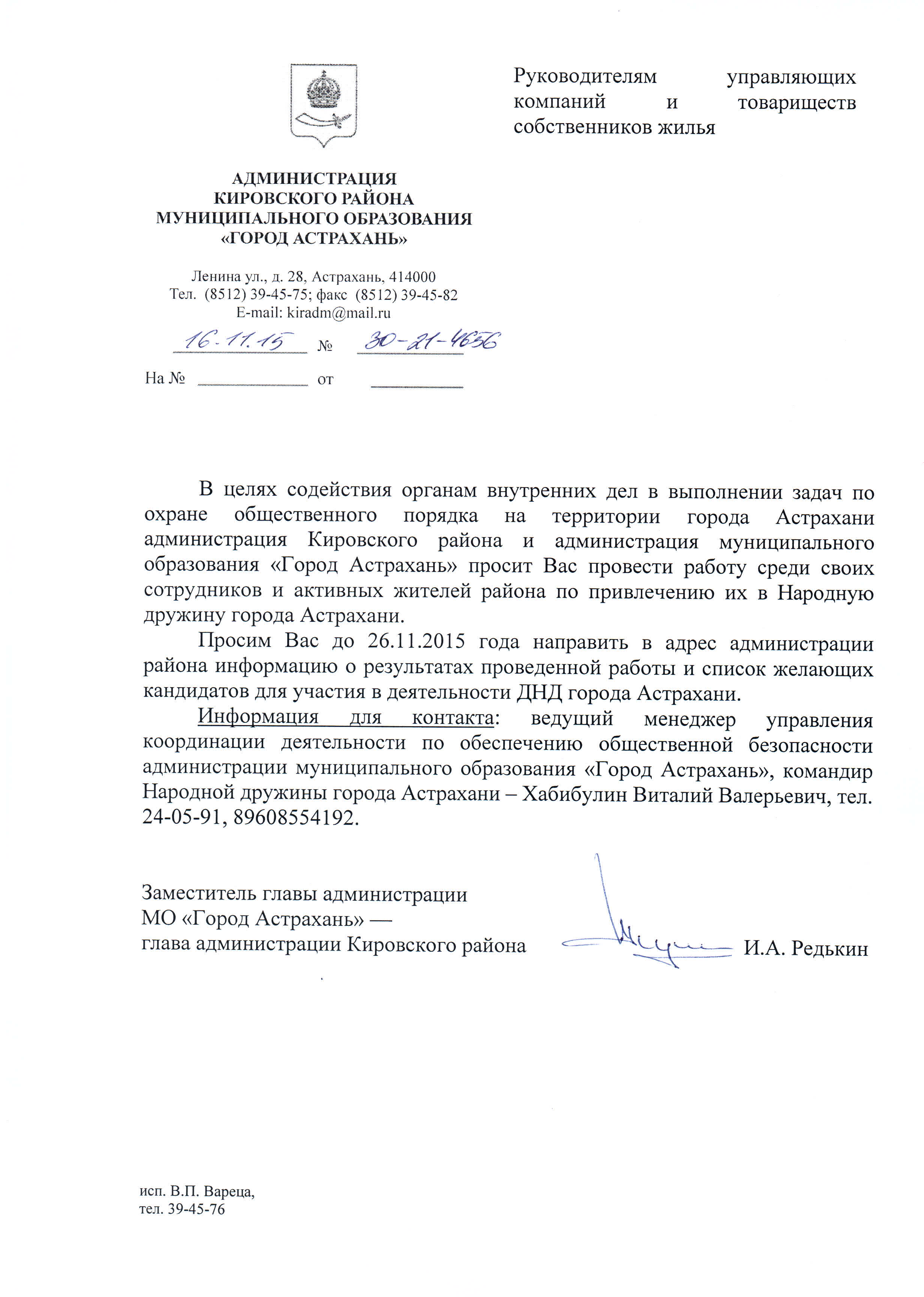 Письмо о привлечении активных жителей в ДНД города Астрахани