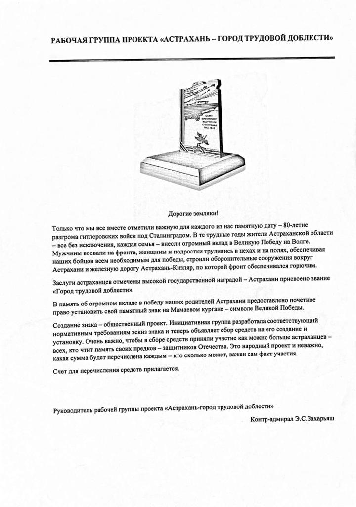 Проект «Астрахань - город трудовой доблести» о воздвижении памятного знака