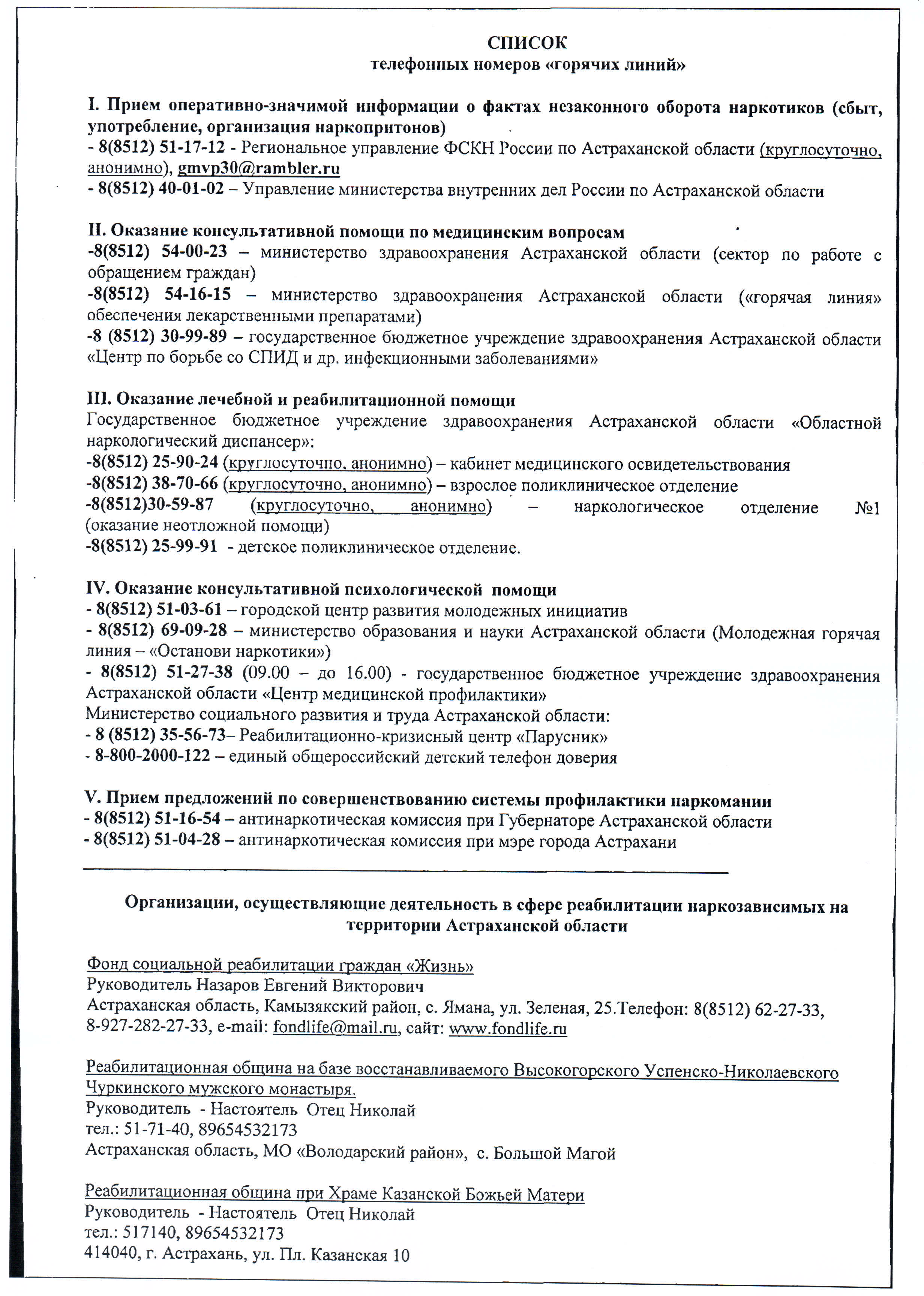 СПИСОК ТЕЛЕФОННЫХ НОМЕРОВ "ГОРЯЧИХ ЛИНИЙ"