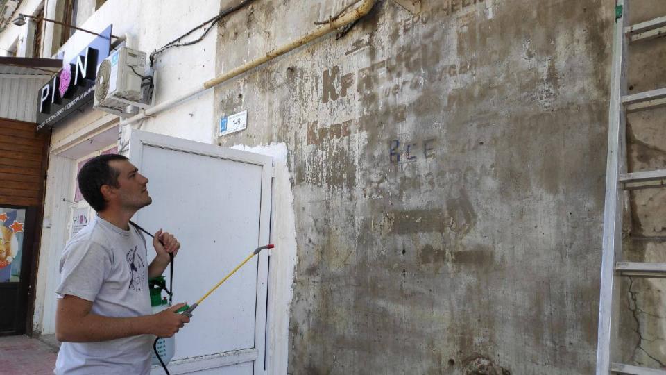 Для восстановления надписи инициативная группа вместе с активными жителями этого дома вымыли стену, взяли пробу покрытия и провели грунтовку поверхности. После этих процедур с соблюдением исторической цветовой гаммы, повторением шрифтов и расположения символов была нанесена надпись. Членам группы удалось выяснить, в этом доме ранее базировалась пожарная часть, где работали преимущественно девушки, так как мужчины служили на фронте. Предположительно, надпись была их инициативой в поддержку советских воинов. Администрация города благодарит всех участников восстановительных работ, которые вложили свои силы в воссоздании этой части событий военных лет.