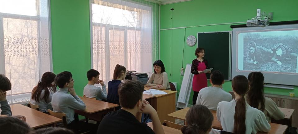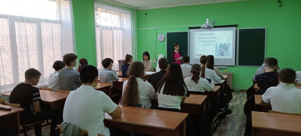 Во время урока учащиеся услышали о героических подвигах астраханских медиков: Калюжной Марии Григорьевны, Кузьминой Веры Александровны, Карибьянца Андраника Семеновича, Антасевич-Школьник Анны Рувимовны, Филякова Бориса Павловича, Тарасьяна Степана Абрамовича и других наших земляков, чей самоотверженный труд вошел в историю битвы, перевернувшей ход Великой Отечественной войны 1941-1945гг.