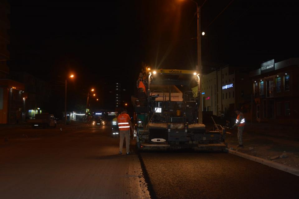 Старое покрытие на проезжей части предварительно полностью отфрезеровали на площади почти 16 тысяч квадратных метров и установили около двух тысяч погонных метров бордюрного камня. В укладке асфальта задействовали около 20 единиц спецтехники, в том числе три асфальтоукладчика. За ночь выполнили около 30% от общего объёма.