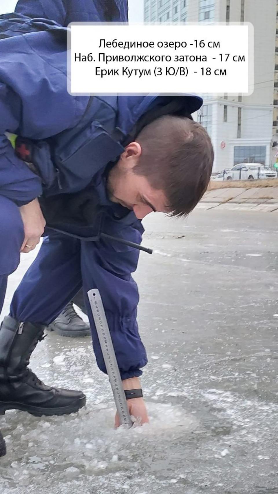 В настоящее время толщина льда на Лебедином озере составляет 16 сантиметров, на Варвациевском канале – 17 сантиметров, а на ерике Кутум в микрорайоне 3-й Юго-Восток этот показатель равен 18 сантиметрам. Однако, находиться на льду всё ещё опасно. При массовом выходе людей толщина льда должна быть не менее 25 см.