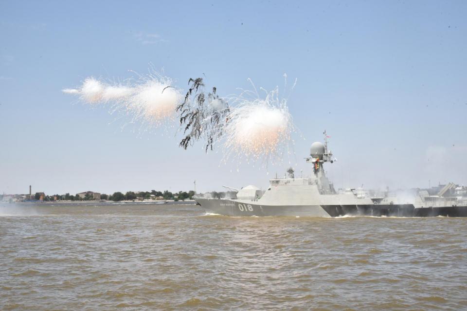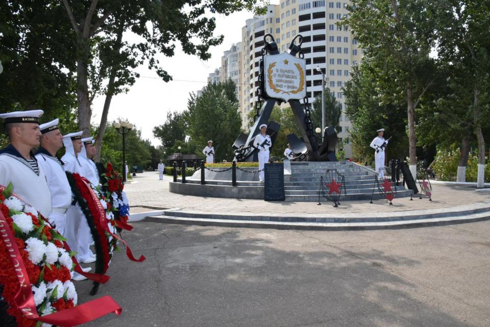 До начала военного парада руководители области и города вместе с ветеранами и командирами Каспийской флотилии почтили память моряков, павших при исполнении боевого долга, возложением венков к памятнику погибшим кораблям Каспийской флотилии.