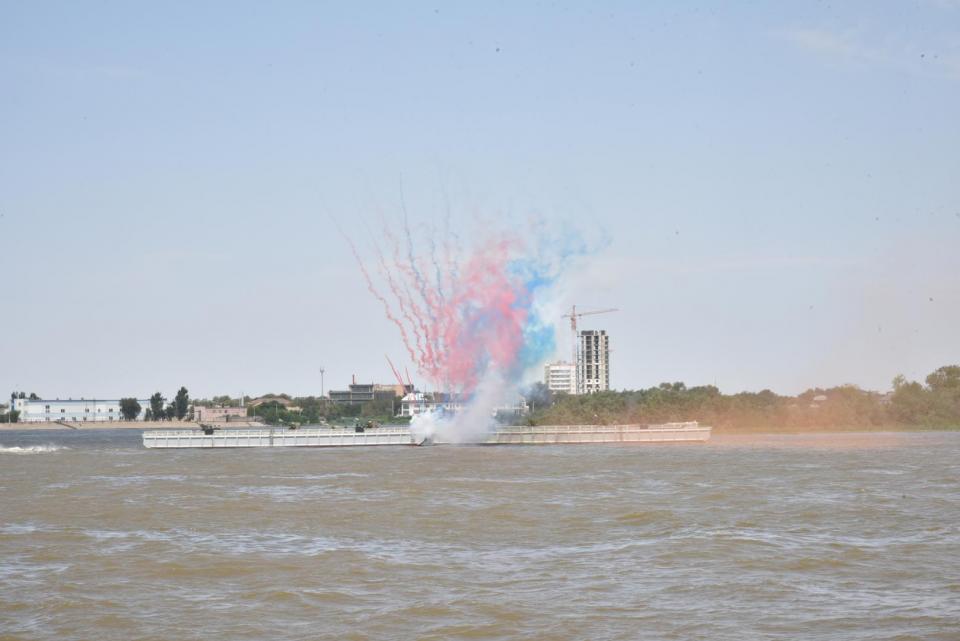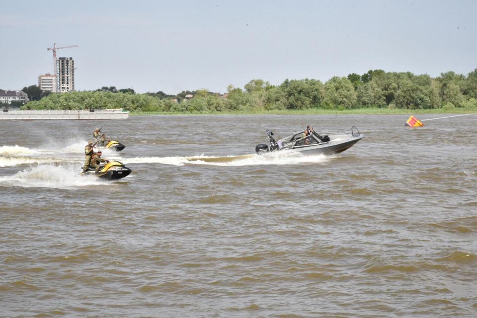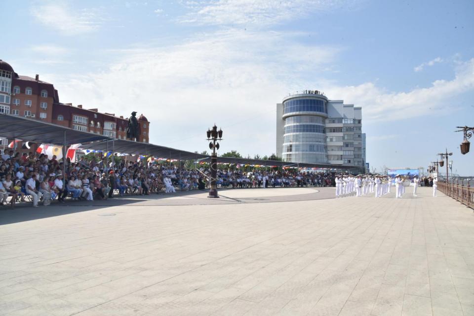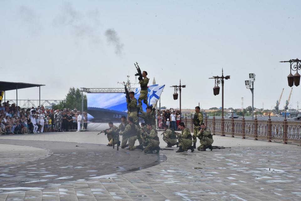 Затем на набережной у памятника ПетруI стартовал большой военно-спортивный праздник. В торжествах были задействованы более тысячи человек личного состава и около сорока единиц техники. Перед зрителями прошли корабли с флагами и стендами с символикой ВМФ, в том числе малый ракетный корабль "Град Свияжск", сторожевой корабль "Дагестан", малый ракетный корабль "Углич". Также в строю – артиллерийские катера, тральные силы, боевая техника морской пехоты. Всего на День ВМФ астраханцам и гостям города были представлены более десяти военных эпизодов. Подрыв плавающих мин, рукопашные бои, стрельба из артиллерийских установок – зрители смогли насладиться захватывающим зрелищем. Особенным номером в программе стал своеобразный «танец» – под звуки вальса на воде синхронно кружились несколько пожарных буксиров.