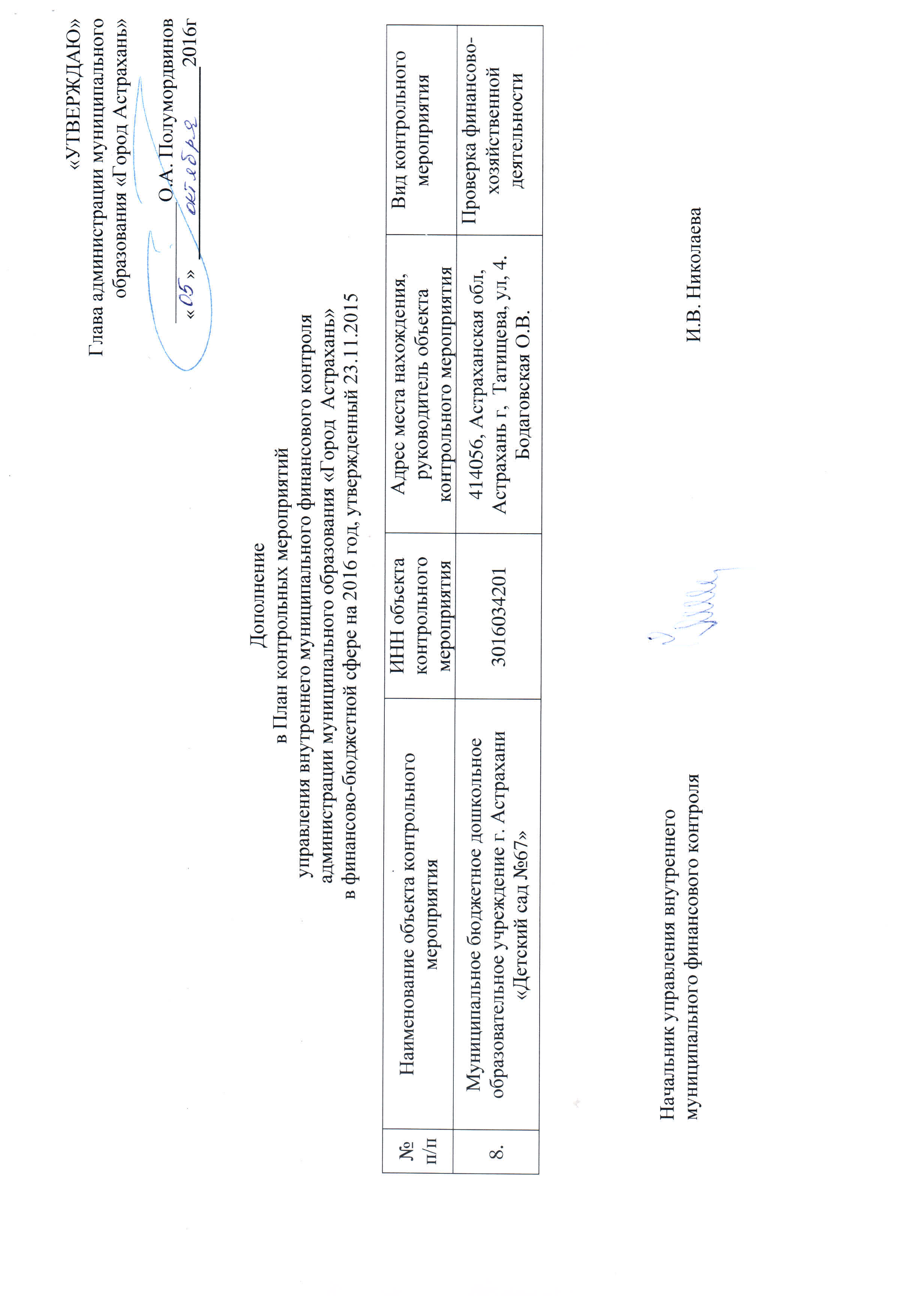 План контрольных мероприятий управления внутреннего муниципального финансового контроля администрации муниципального образования «Город Астрахань» в финансово-бюджетной сфере на 2016 год дополнен проведением проверки в муниципальном бюджетном дошкольном образовательном учреждении города Астрахани «Детский сад №67».