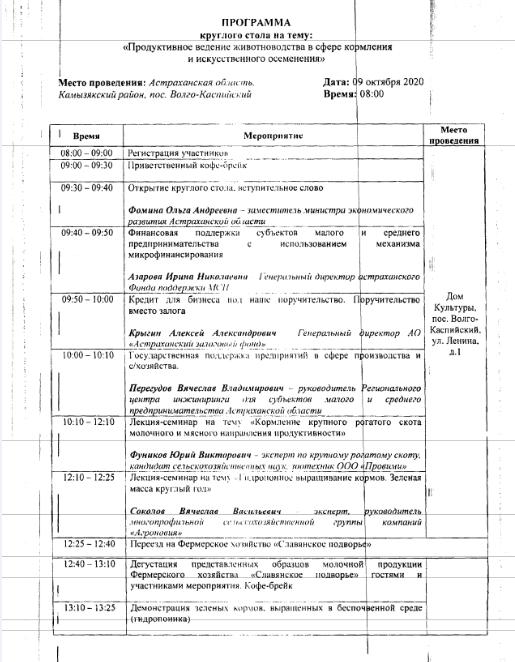 В целях реализации мероприятий по государственной подержке субъектов малого и среднего предпринимательства в области сельскохозяйственного производства министерство экономического развития Астраханской области и автономное учреждение Астраханской области "Астраханский областной инновационный центр" организует круглый стол на тему "Продуктивное ведение животноводства в сфере кормления и искусственного осеменения", который состоится 09.10.2020 по адресу: Астраханская область, Камызякский район, пос.Волго-Каспийский (дом Культуры, пос. Волго-Каспийский, ул.Ленина, д.1., Фермерское хозяйство "Славянское подворье").