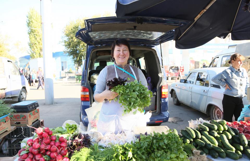 Жительница Наримановского района Равиля Мухажинова реализует зелень, огурцы и редис, выращенные на собственном приусадебном участке. Астраханка признается: «Ярмарка у стадиона считается самой лучшей, потому что сюда приходит очень много народу. А здесь все только самое свежее, и все это можно реализовать».