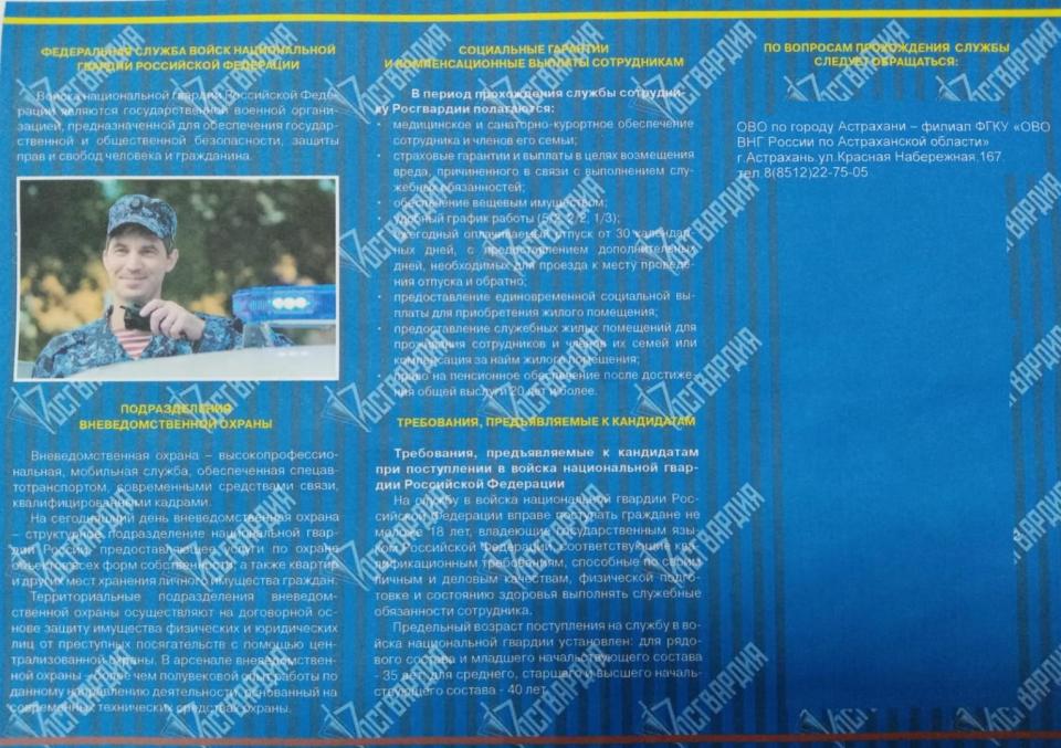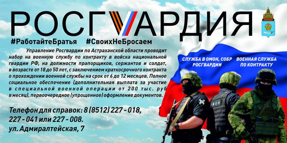Управление Росгвардии по Астраханской области проводит набор на военную службу по контракту в войска национальной гвардии РФ, на должности прапорщиков, сержантов и солдат в возрасте от 18 до 50 лет с заключением краткосрочного контракта о прохождении военной службы на срок от 6 до 12 месяцев. Полное социальное обеспечение (дополнительная выплата за участие в специальной военной операции от 200 тыс. руб в месяц), первоочередное (упрощенное) оформление документов.