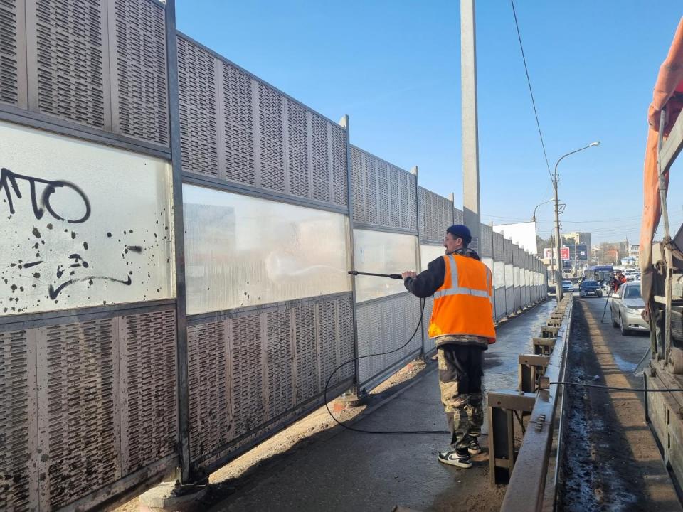 Работы будут вестись и в субботу. Так завтра бригада «Чистого города» выйдет на помывку моста Милицейского. Коммунальщики будут очищать от грязи и пыли шумовые экраны.