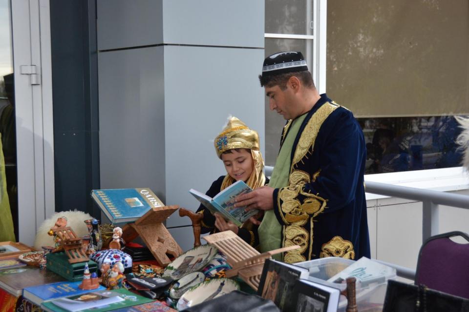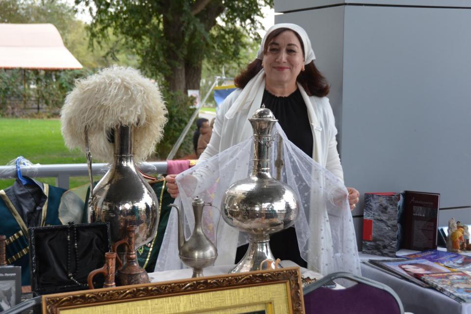 На территории, прилегающей к отелю «Азимут», развернулась выставка, где национально-культурные общества представили свою самобытную культуру: предметы одежды, утвари, музыкальные инструменты, книжную продукцию.