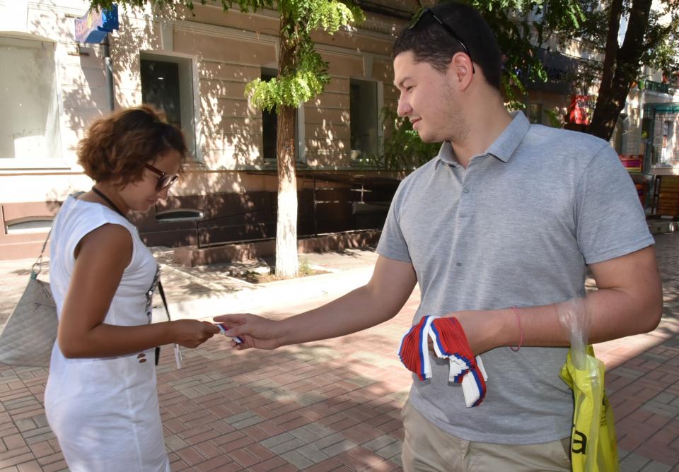 Сегодня по всей стране проходят мероприятия, посвященные Дню Государственного флага Российской Федерации. В Астрахани праздник начался с традиционной акции «Триколор», организованной администрацией города. На ул. Кирова активисты молодежных общественных объединений раздают бело-сине-красные ленточки всем прохожим.