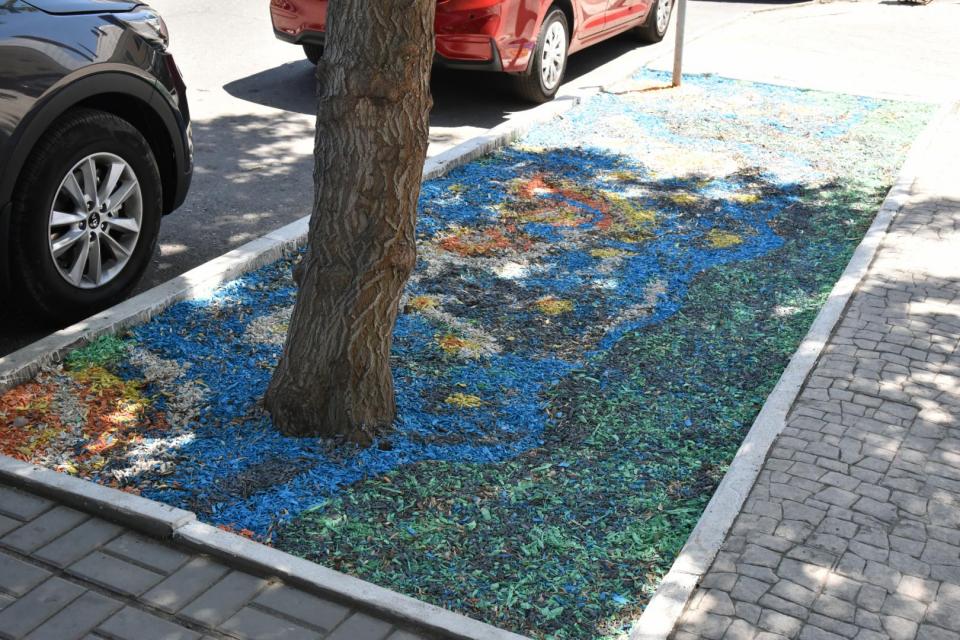 «Мы красим щепу в разные цвета, а затем выкладываем из нее картины по мотивам произведений всемирно известных художников. В основу нашего пилотного проекта легли «Звездная ночь» Ван Гога и абстрактная картина Пита Мондриана», — рассказал ландшафтный дизайнер муниципального предприятия «Зеленый город» Анастасия Чернявская.