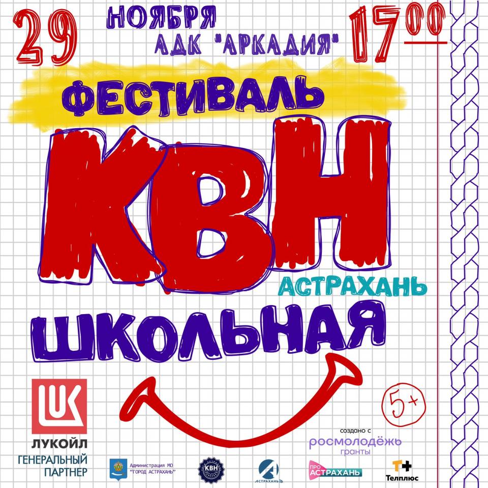 29 ноября в 17:00 во дворце культуры «Аркадия» (ул. Калинина, 51) состоится фестиваль лиги КВН «Астрахань.Школьная». В нем примут участие самые яркие команды средних общеобразовательных учреждений города, области и соседних регионов.