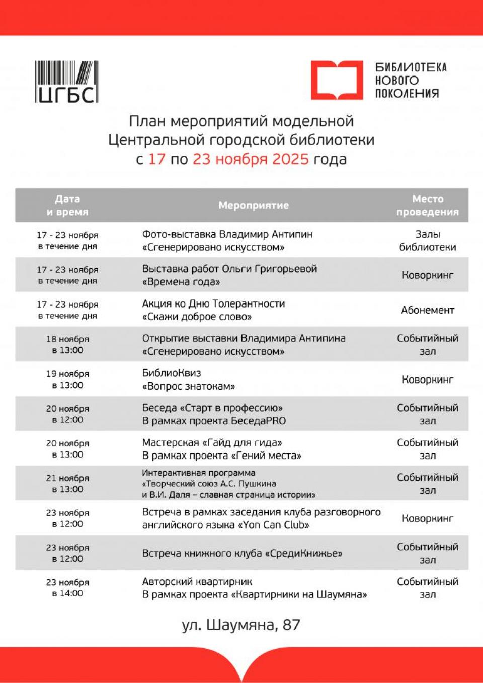 Впрочем, это только часть программы, запланированной на следующей неделе в модельных библиотеках. Так, планируется встреча книжного клуба, библиоквиз, лекции, мастер-классы, будут работать мастерские и игротеки. Вход на все мероприятия бесплатный. Подробная программа с указанием времени в карточках.