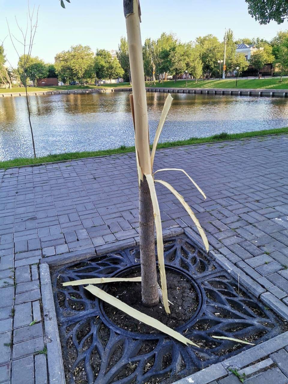 Три японские софоры пострадали от рук вандалов на Лебедином озере. Острым ножом со стволов срезали кору и раскидали ее рядом.
