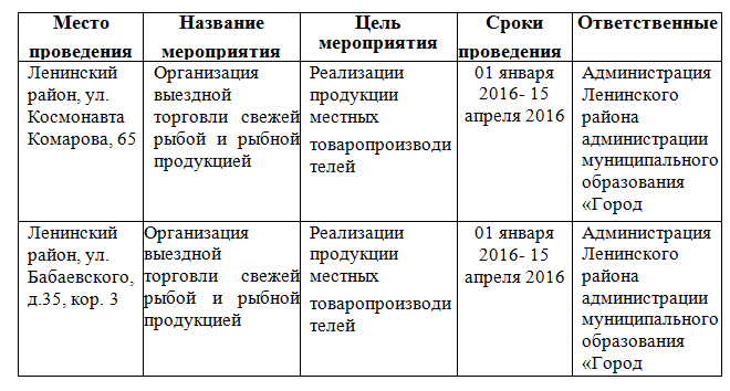 Администрация муниципального образования «Город Астрахань» в период с 01.01.2016 по 15.04.2016 организовывает проведение городского мероприятия по организации выездной торговли свежей рыбой и рыбной продукцией, в рамках которого будет организована розничная торговля по реализации продукции товаров местных производителей.
