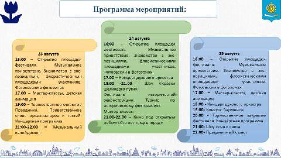 18:00 - 21.00 – шоу «Краски шелкового пути», фестиваль исторической реконструкции, турнир по историческому фехтованию, мастер-классы;