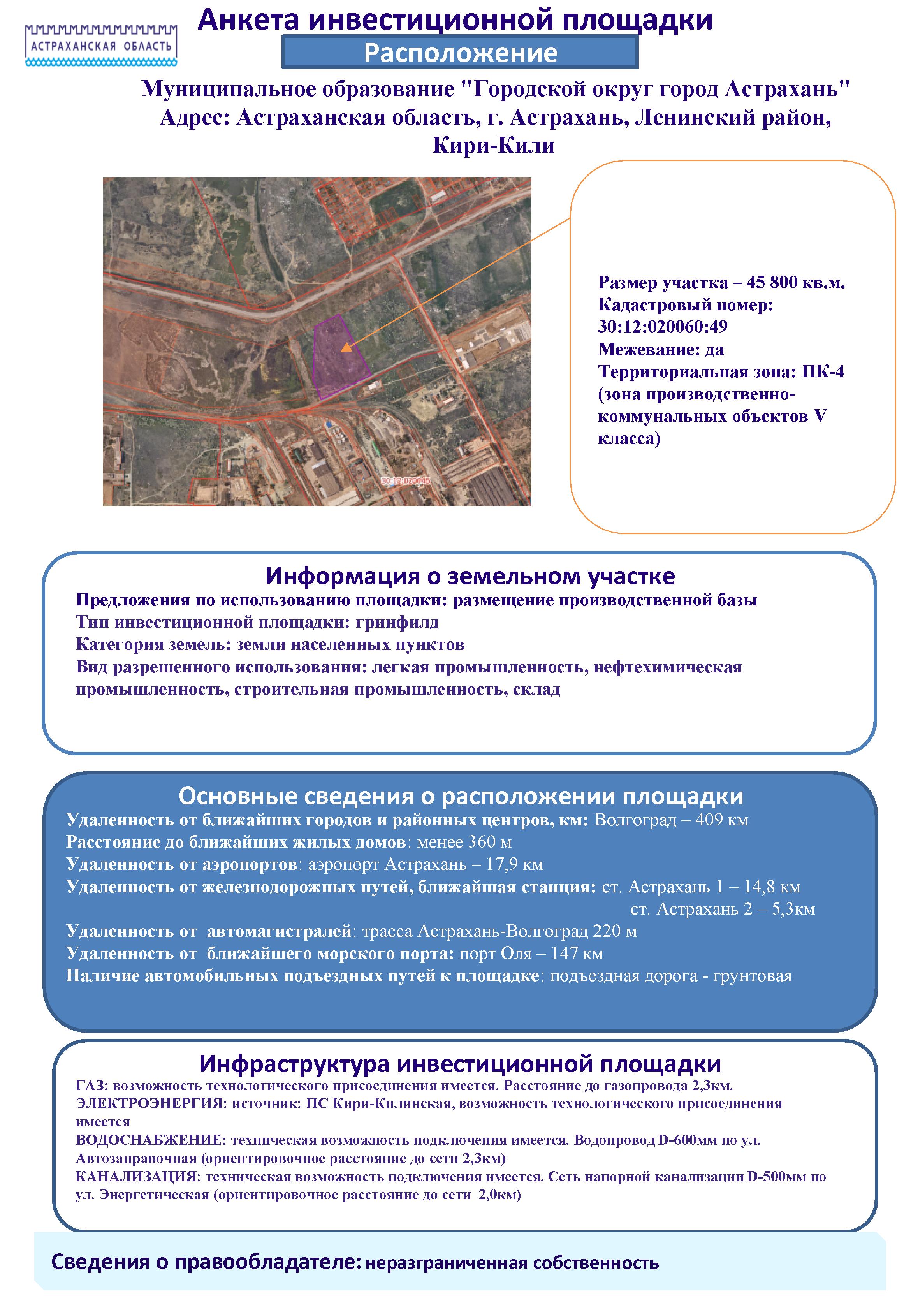 - Анкета инвестиционной площадки Астраханская область, г. Астрахань, Ленинский район, Кири-Кили