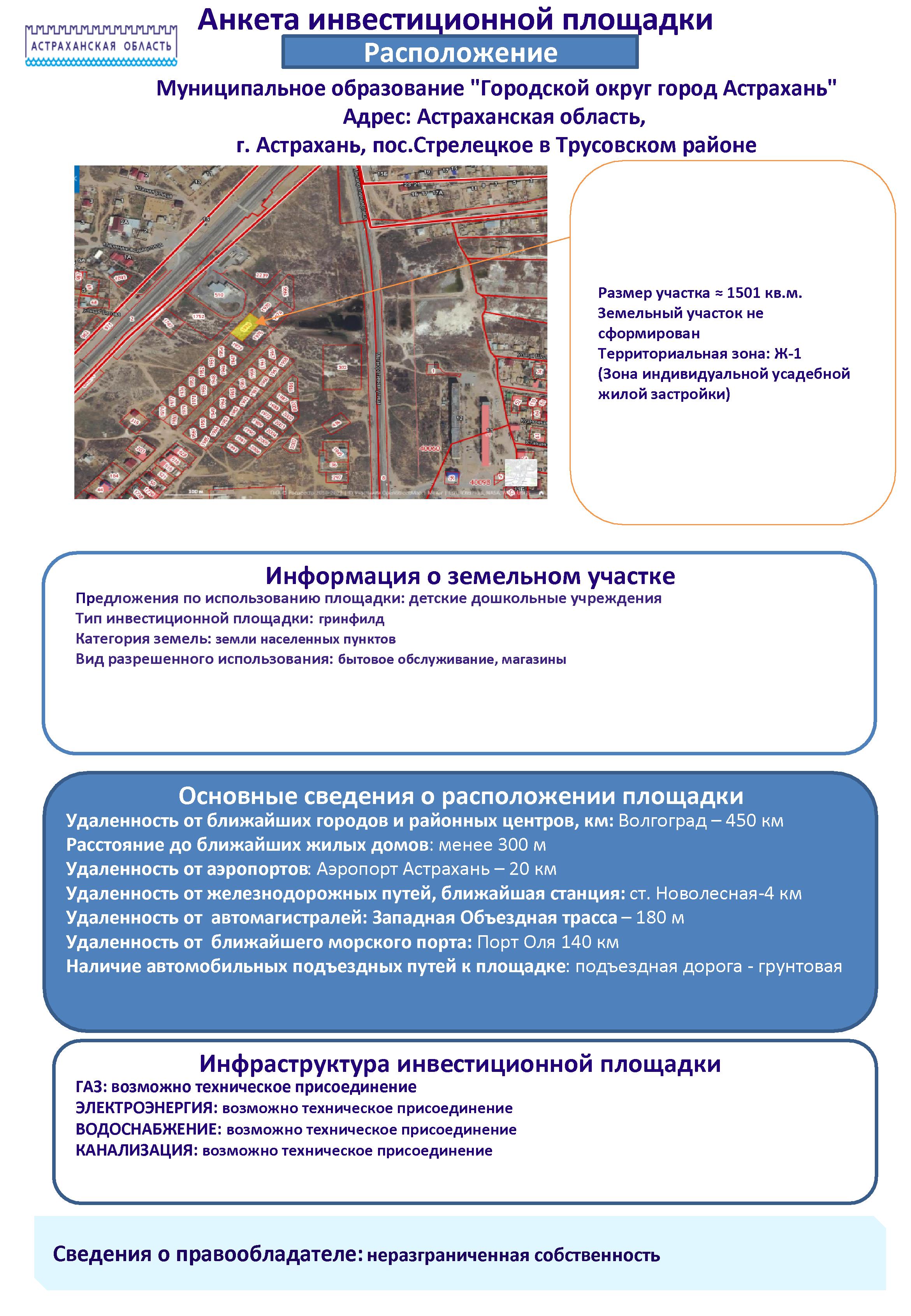 Анкета инвестиционной площадки Астраханская область, г. Астрахань, пос.Стрелецкое в Трусовском районе