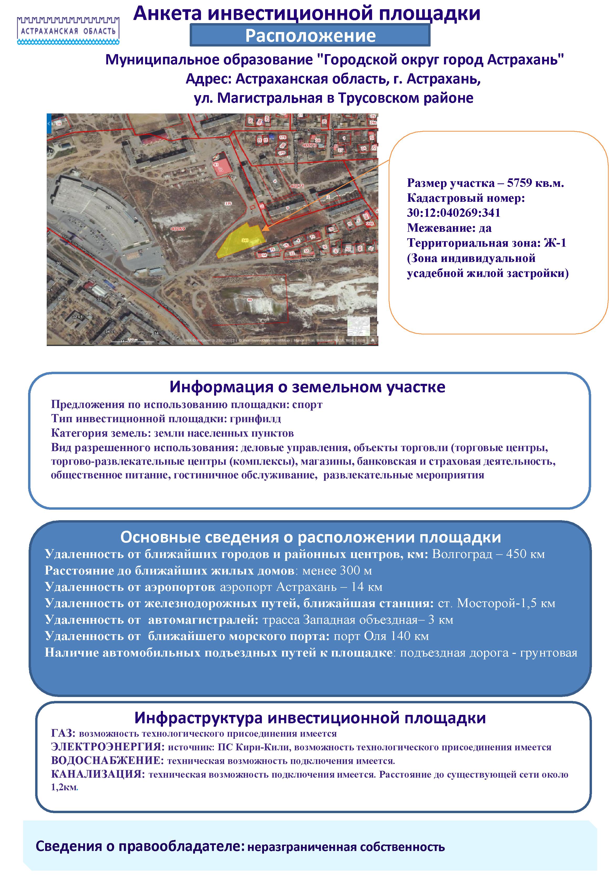 - Анкета инвестиционной площадки Астраханская область, г. Астрахань, ул. Магистральная в Трусовском районе