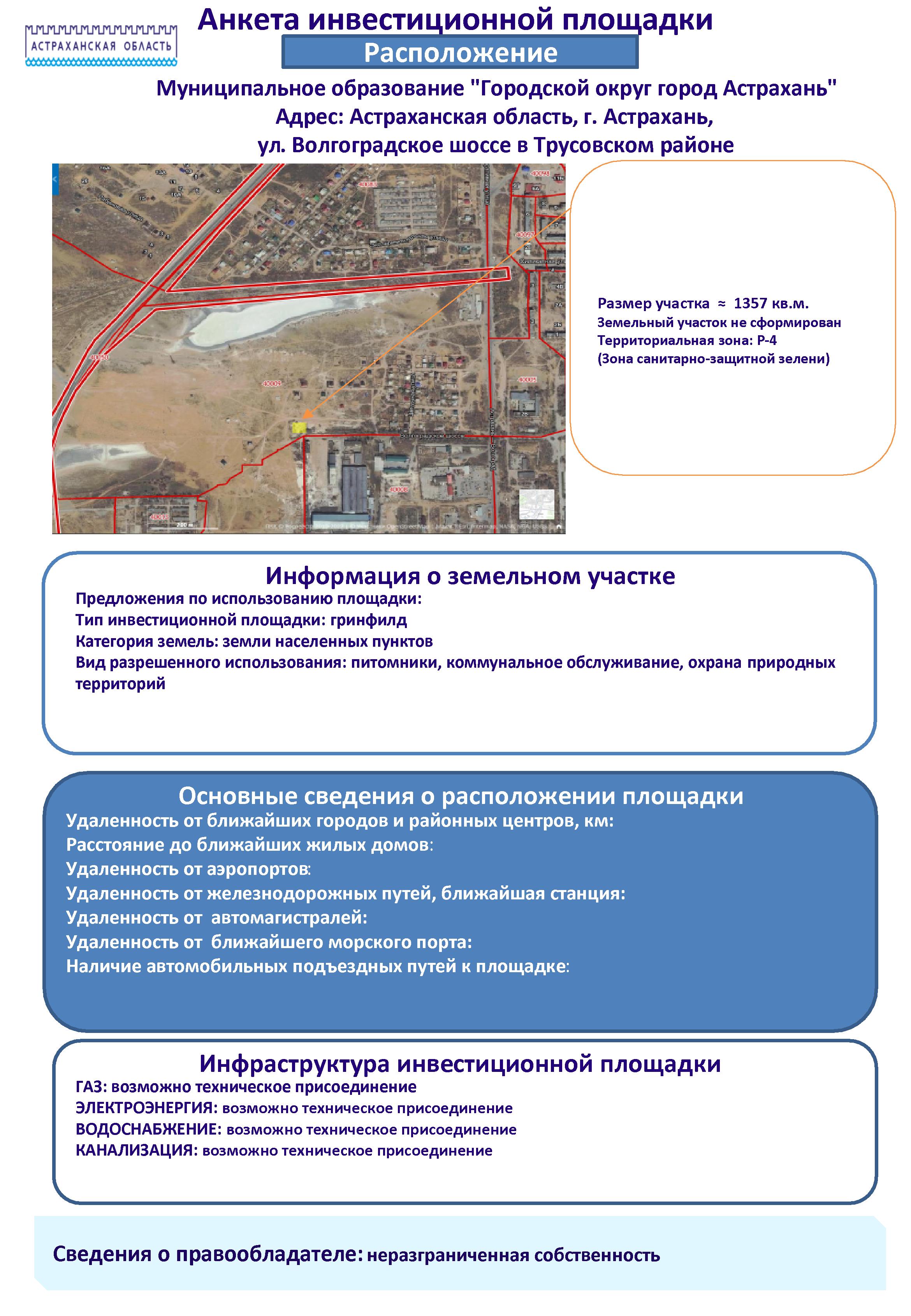 - Анкета инвестиционной площадки Астраханская область, г. Астрахань, ул. Волгоградское шоссе в Трусовском районе