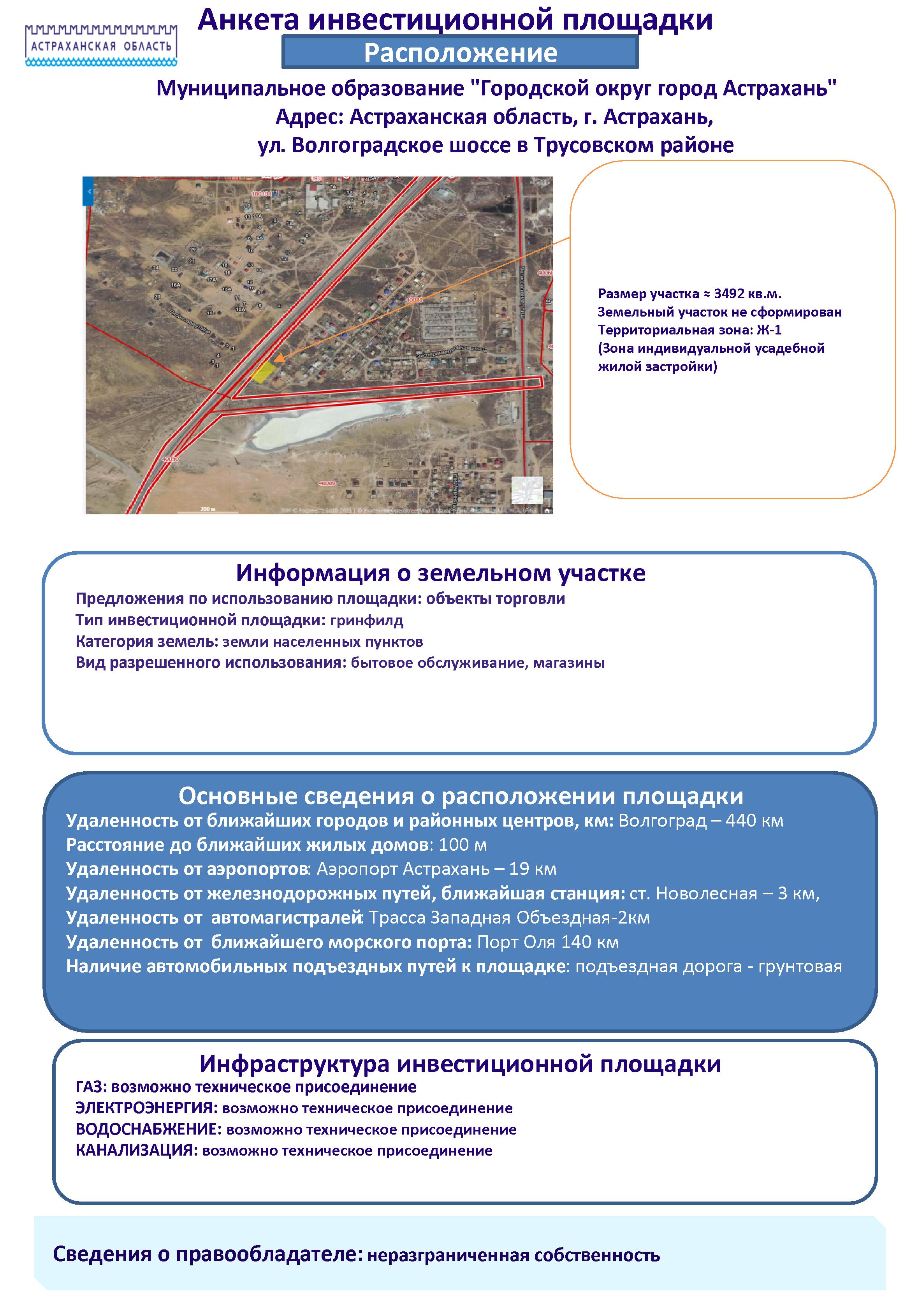 - Анкета инвестиционной площадки Астраханская область, г. Астрахань, ул. Волгоградское шоссе в Трусовском районе