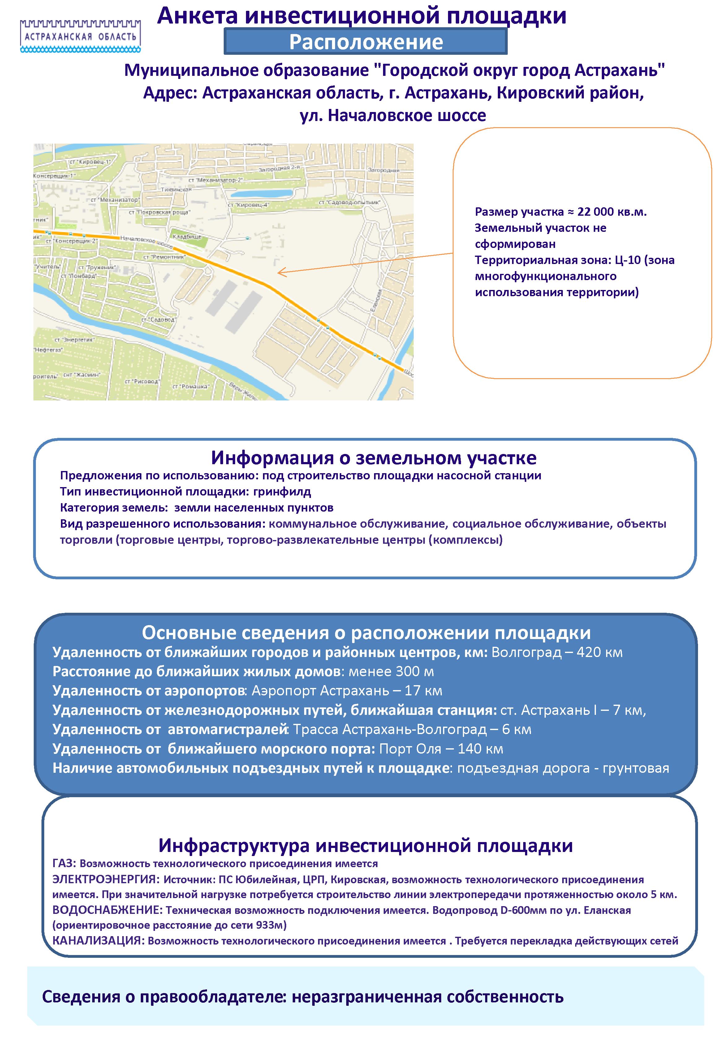 Анкета инвестиционной площадки г. Астрахань, Кировский район, ул. Началовское шоссе