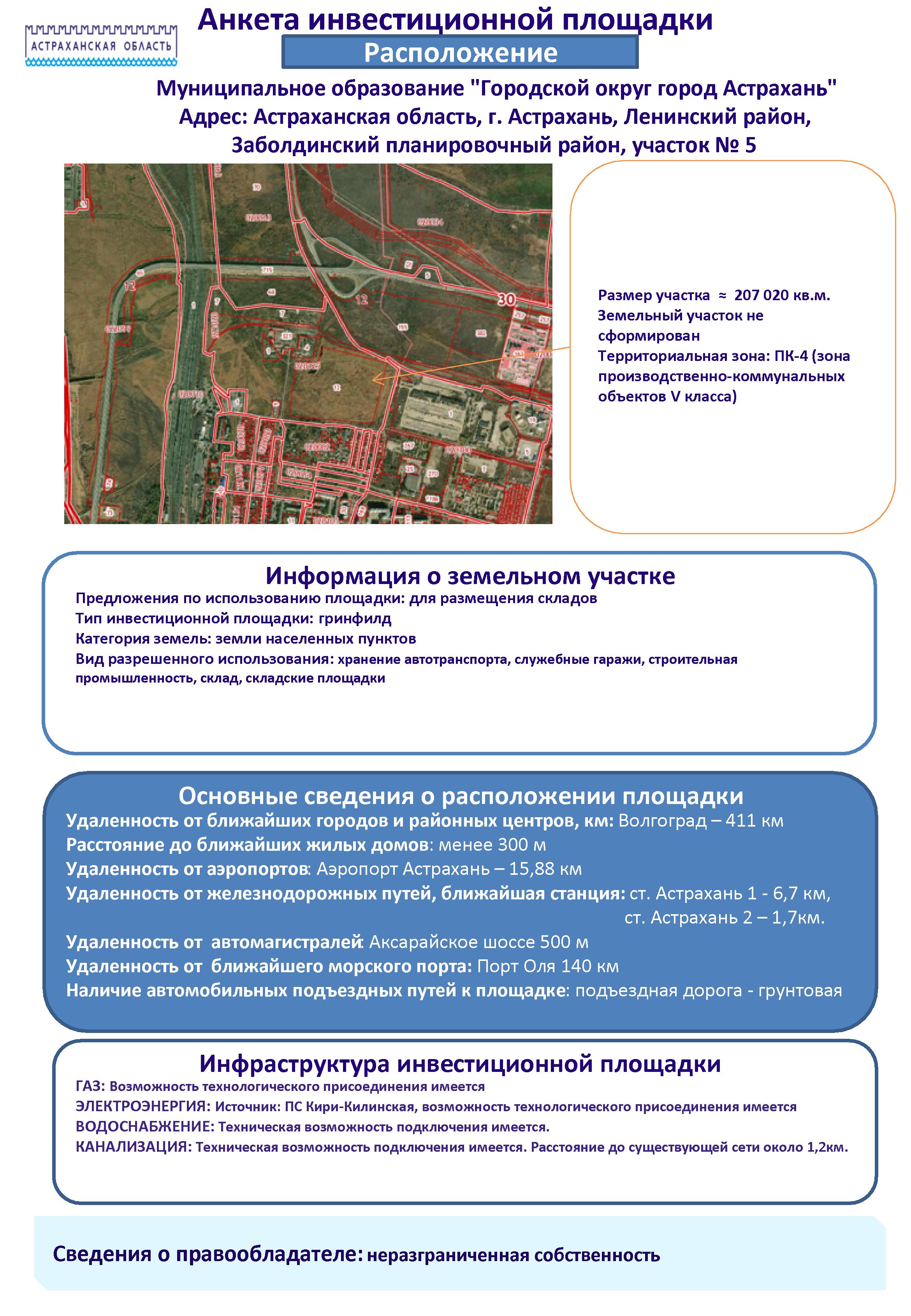 Анкета инвестиционной площадки г. Астрахань, Ленинский район, Заболдинский планировочный район, участок № 5