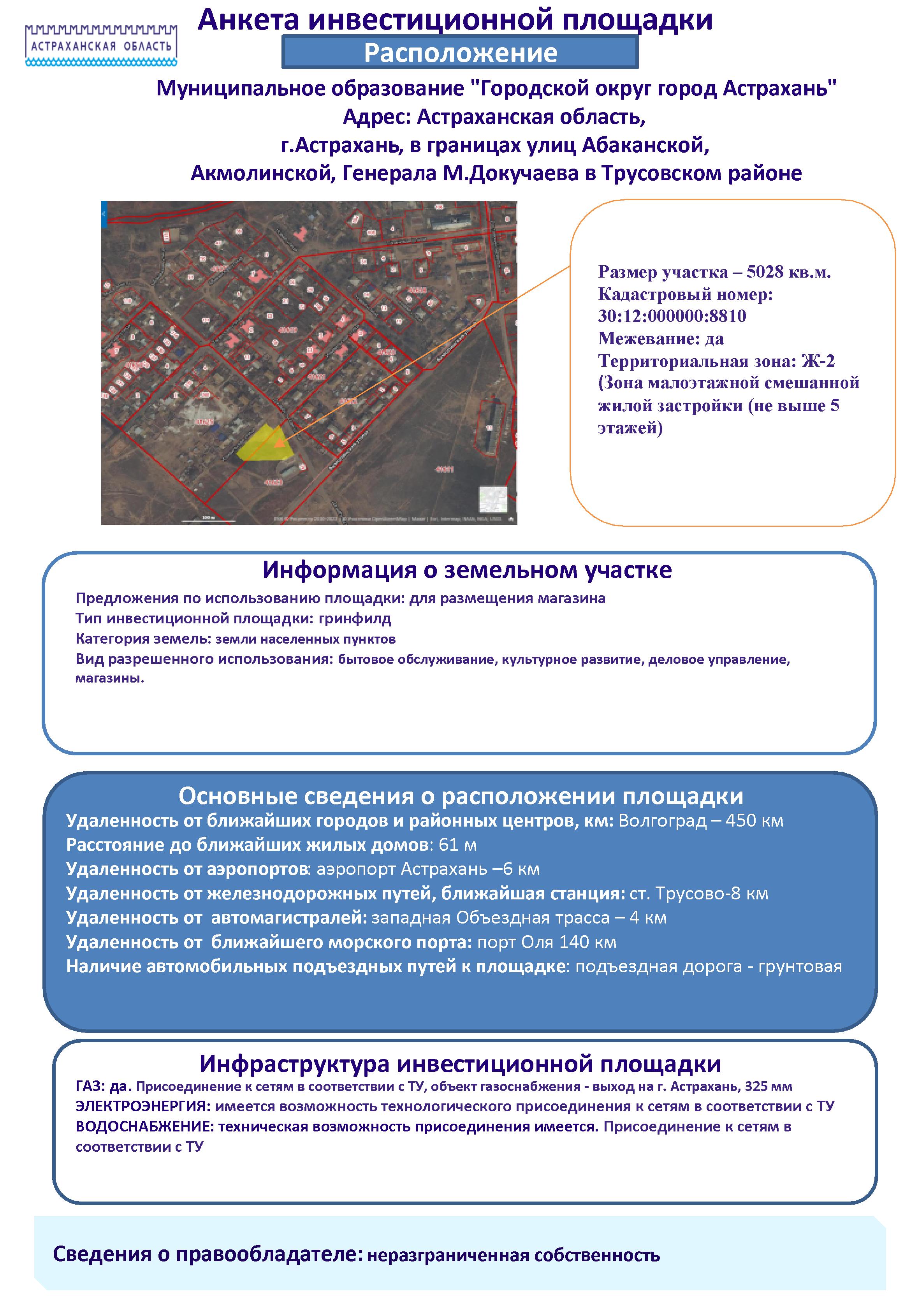 - Анкета инвестиционной площадки г. Астрахань, в границах ул. Абаканской, Акмолинской, Генерала М.Докучаева в Трусовском р-не