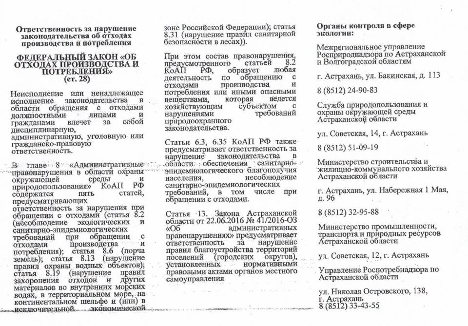 Главная » Администрации районов муниципального образования "Город Астрахань" » Кировский район » Прокуратура Кировского района г. Астрахани информирует » «Правовое просвещение» » Информационный буклет «Ответственность за нарушение законодательства об отходах производства и потребления»