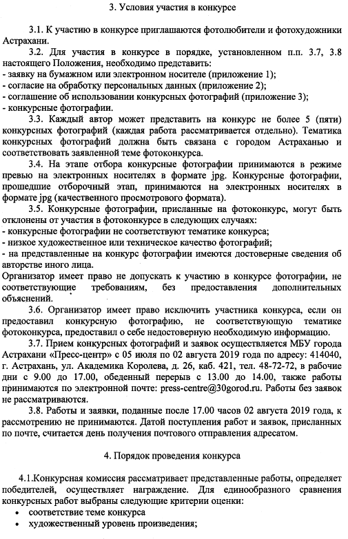 «3.7. Прием конкурсных фотографий и заявок осуществляется МБУ города Астрахани «Пресс-центр» с 05 июля по 14 августа 2019 года по адресу: 414000, г. Астрахань, ул. Академика Королева, д. 26, каб. 421, тел.48-72-72, в рабочие дни с 9.00 до 17.00, обеденный перерыв с 13.00 до 14.00, также работы принимаются по электронной почте: press-centre@30gorod.ru. Работы без заявок не рассматриваются.