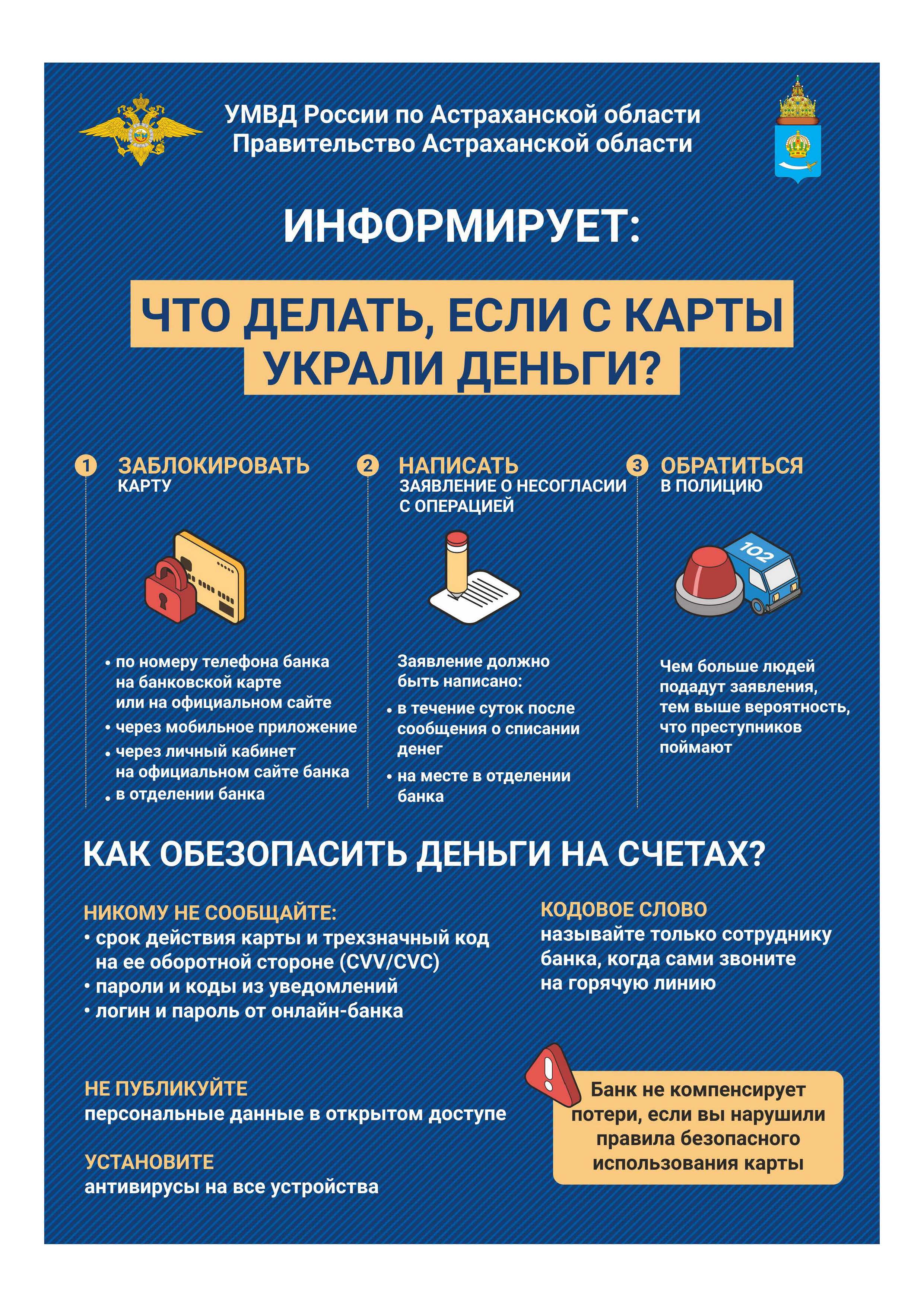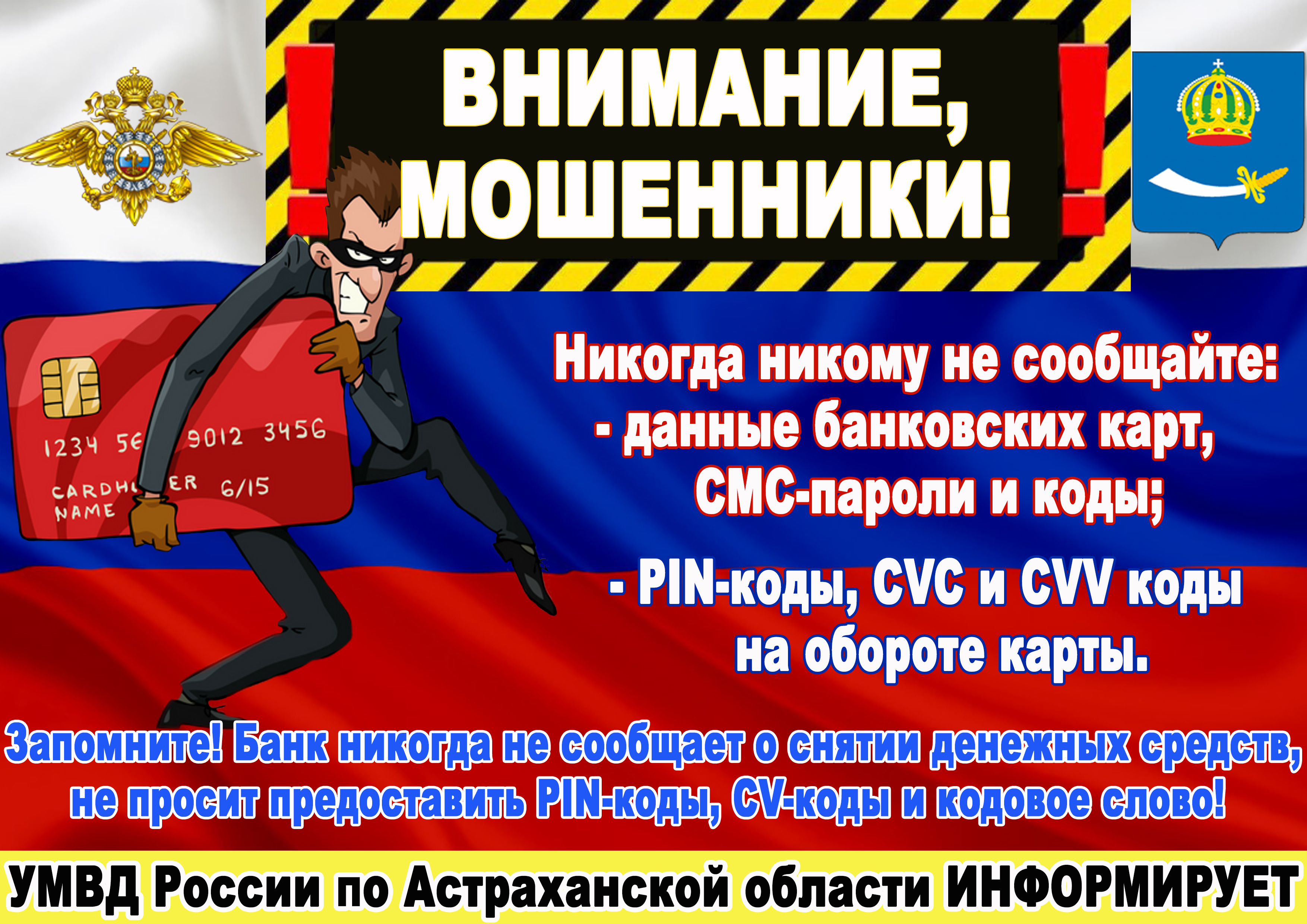 Цель кампании – научить людей распознавать мошенников, рассказать о наиболее распространенных преступных схемах. В целях обеспечения равномерного охвата аудитории и организации равного доступа к социально значимой информации УМВД России по Астраханской области просит оказать содействие в продвижении проекта на территории муниципальных образований Астраханской области.