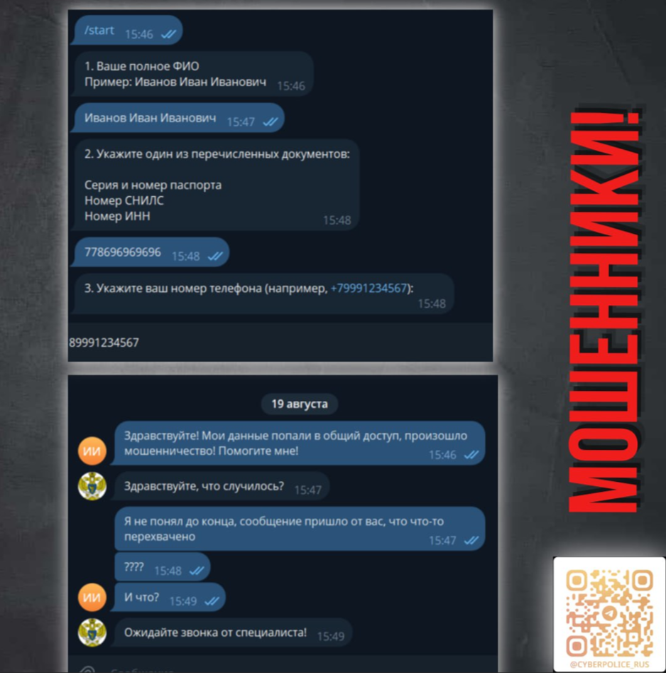 Бот имитирует интерфейс госсервисов (например, ГИС ЖКХ) и под видом проверки запрашивает конфиденциальные данные: ФИО, паспорт, СНИЛС, ИНН, номер телефона.