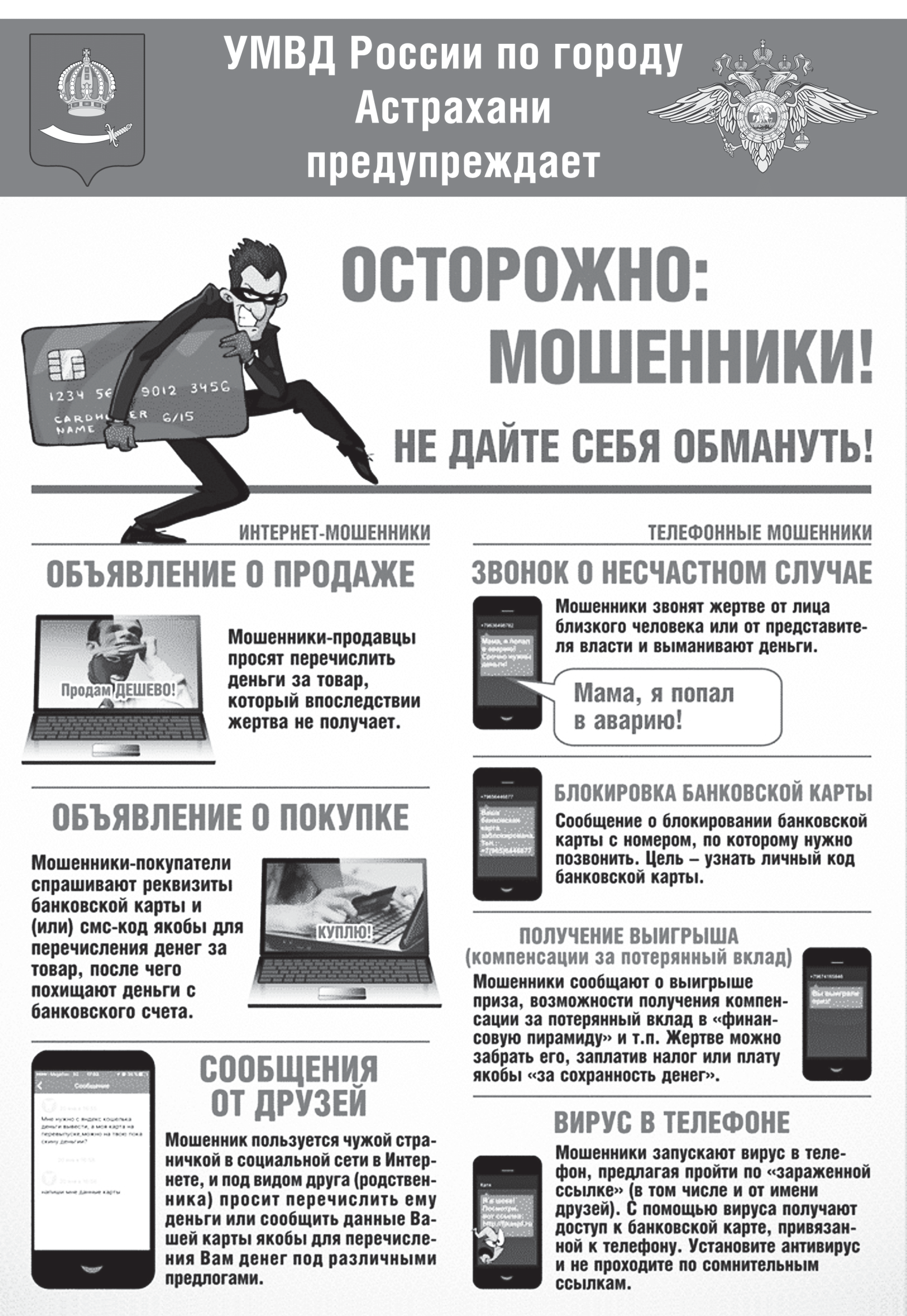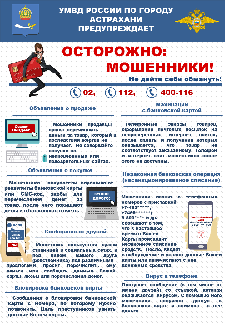 Управлением Министерства внутренних дел Российской Федерации по Астраханской области с 19 по 26 июня 2024 года проводится профилактическая акции «Внимание! Мошенники!» с привлечением максимального количества ведомств и учреждений Астраханской области.