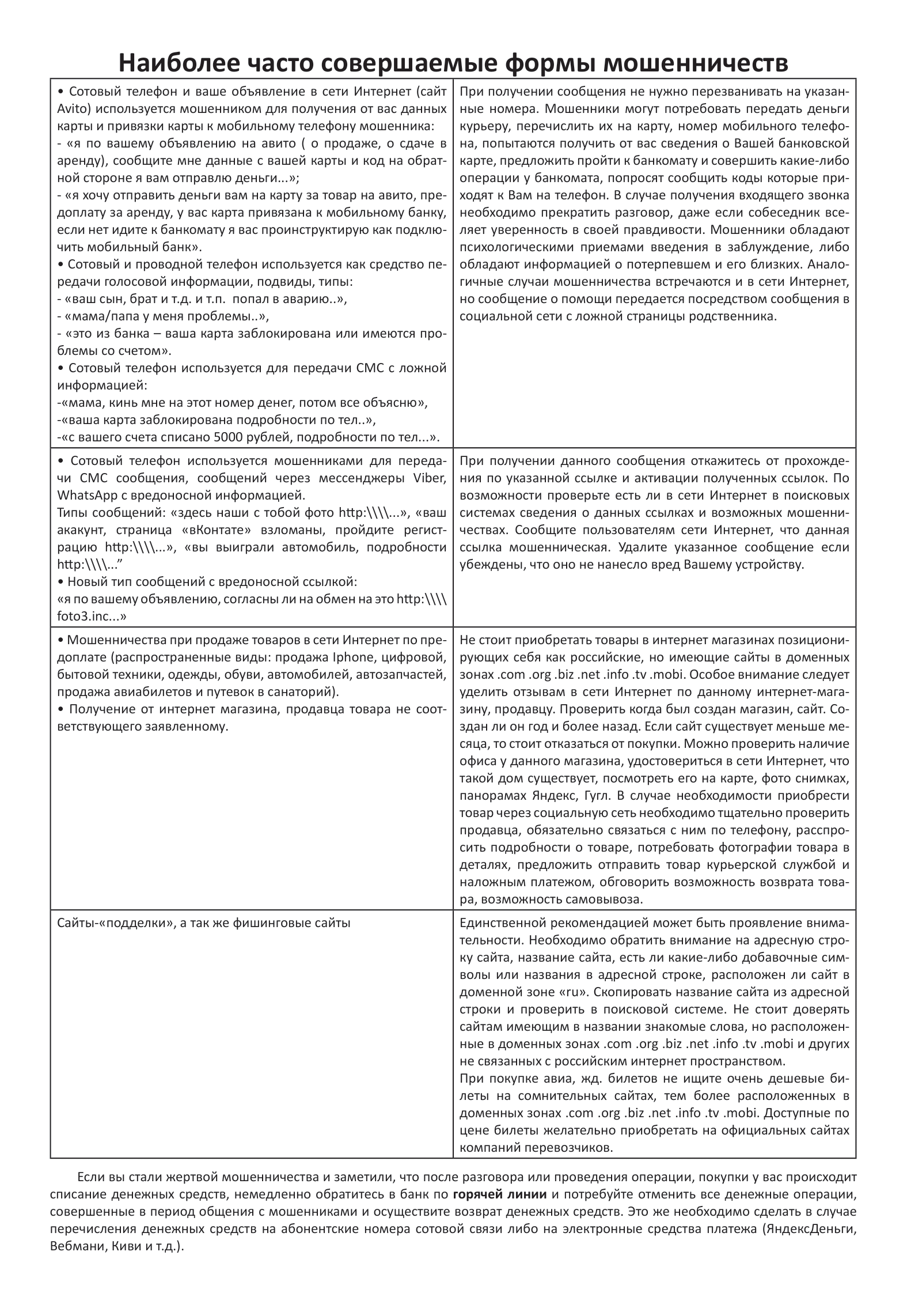 Существует множество различных видов дистанционных мошенничеств, каждый из которых имеет свои особенности и цели. Одной из самых распространенных форм интернет-мошенничеств остается «фишинг» - получение личной информации (паролей, банковских данных) под предлогом официального запроса от банка либо другой организации. Популярными видами интернет-мошенничеств остаются звонки от представителей банковских организаций, мобильных операторов либо правоохранительных органов с целью хищения денежных средств под различными предлогами (отмена оформления несанкционированного кредита, перевода денежных средств за границу, переоформление сим-карты в связи с окончанием срока ее действия и др.), а также обещание быстрой и высокой прибыли при помощи инвестиций и торговли на рынке ценных бумаг. Кроме того, существует масса других видов дистанционных хищений: продажа поддельных товаров или услуг посредством популярных интернет-сервисов, хищение личных данных через вредоносные программы, звонки от лиц, представляющихся родственниками, попавшими в беду. Этот список постоянно растет, преступные схемы стремительно развиваются и совершенствуются.