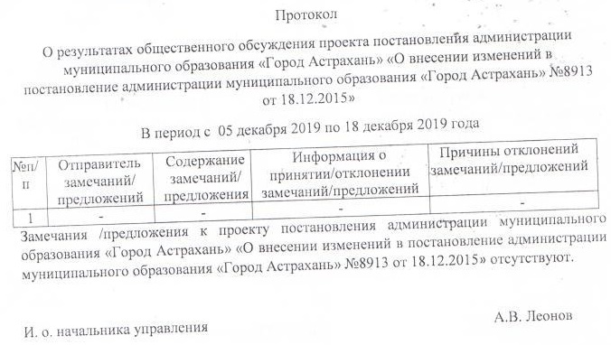» Протокол проведения общественного обсуждения проекта постановления администрации муниципального образования «Город Астрахань»