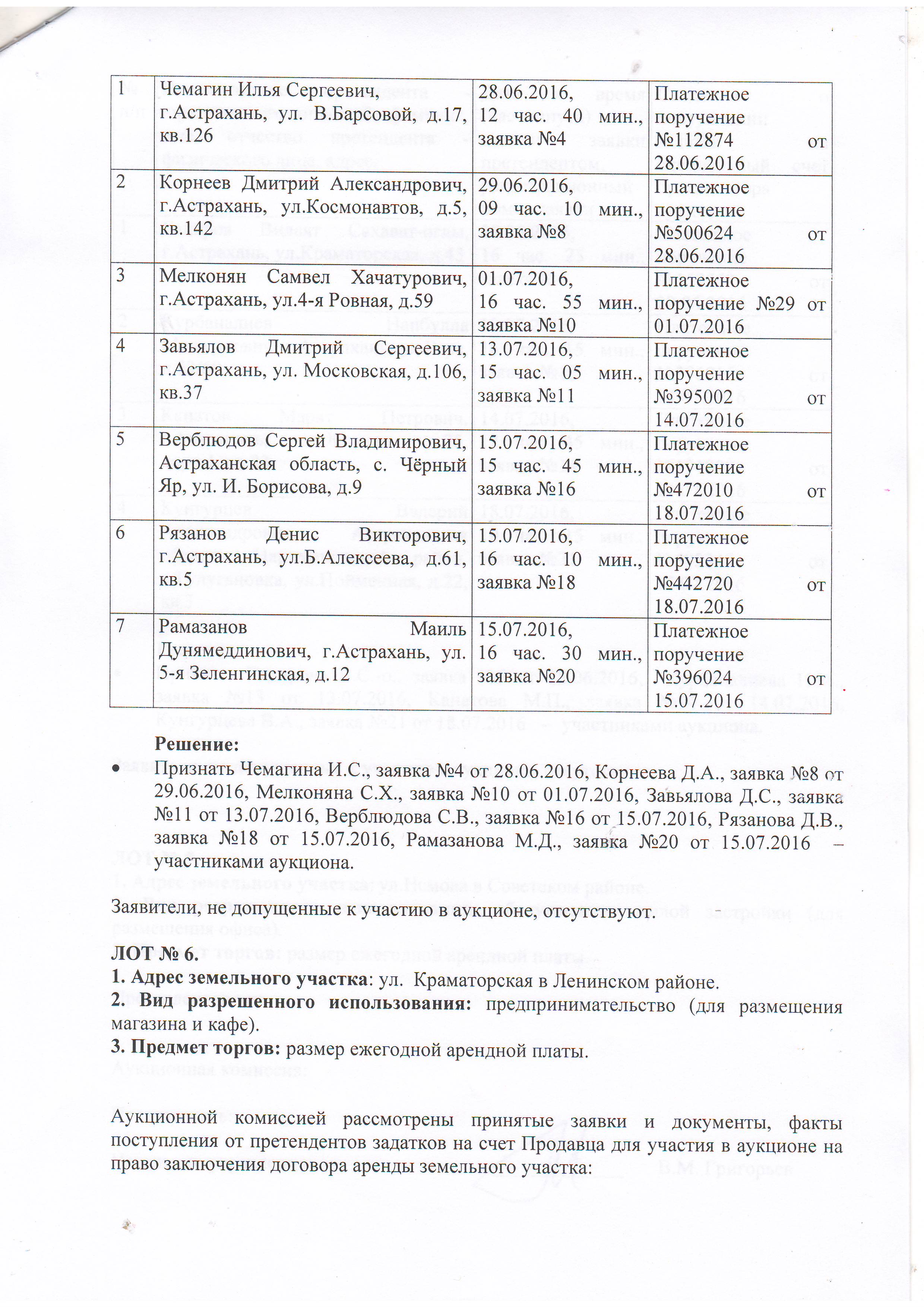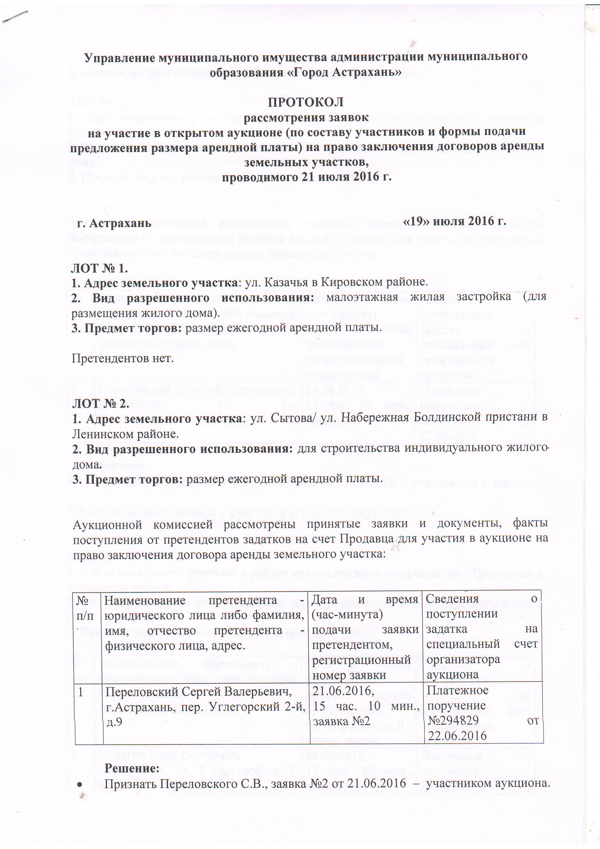 Протокол рассмотрения заявок аукцион 21.07.2016
